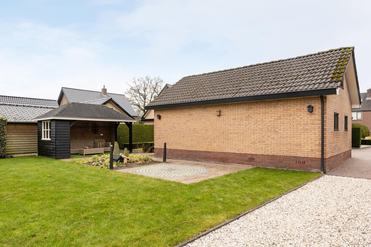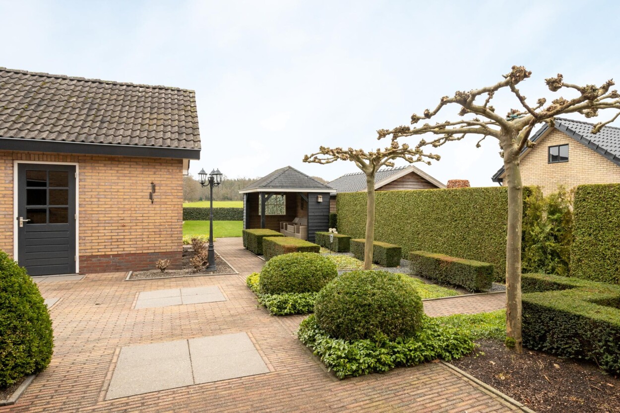 Rondom de woning is een keurig onderhouden en verzorgde tuin aangelegd. Aan de voorzijde is een riante oprit met ruimte voor meerdere auto’s, die ook toegang tot de bijgebouwen verschaft. In de achtertuin zijn diverse terrassen gecreëerd. Er is een mooie afwisseling van sierbestrating en beplantingen. Het achterste gedeelte is in gebruik als gazon met tevens nog een moestuin.