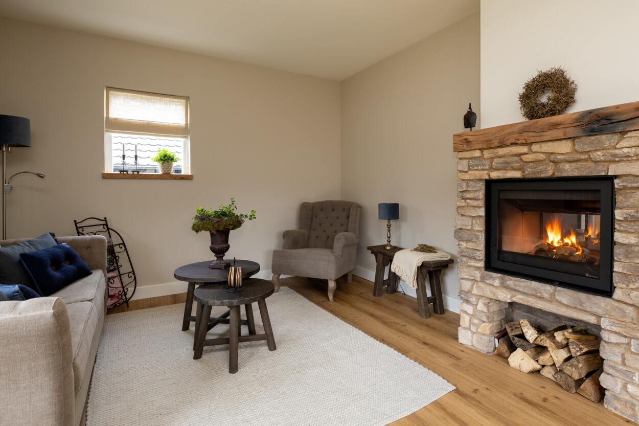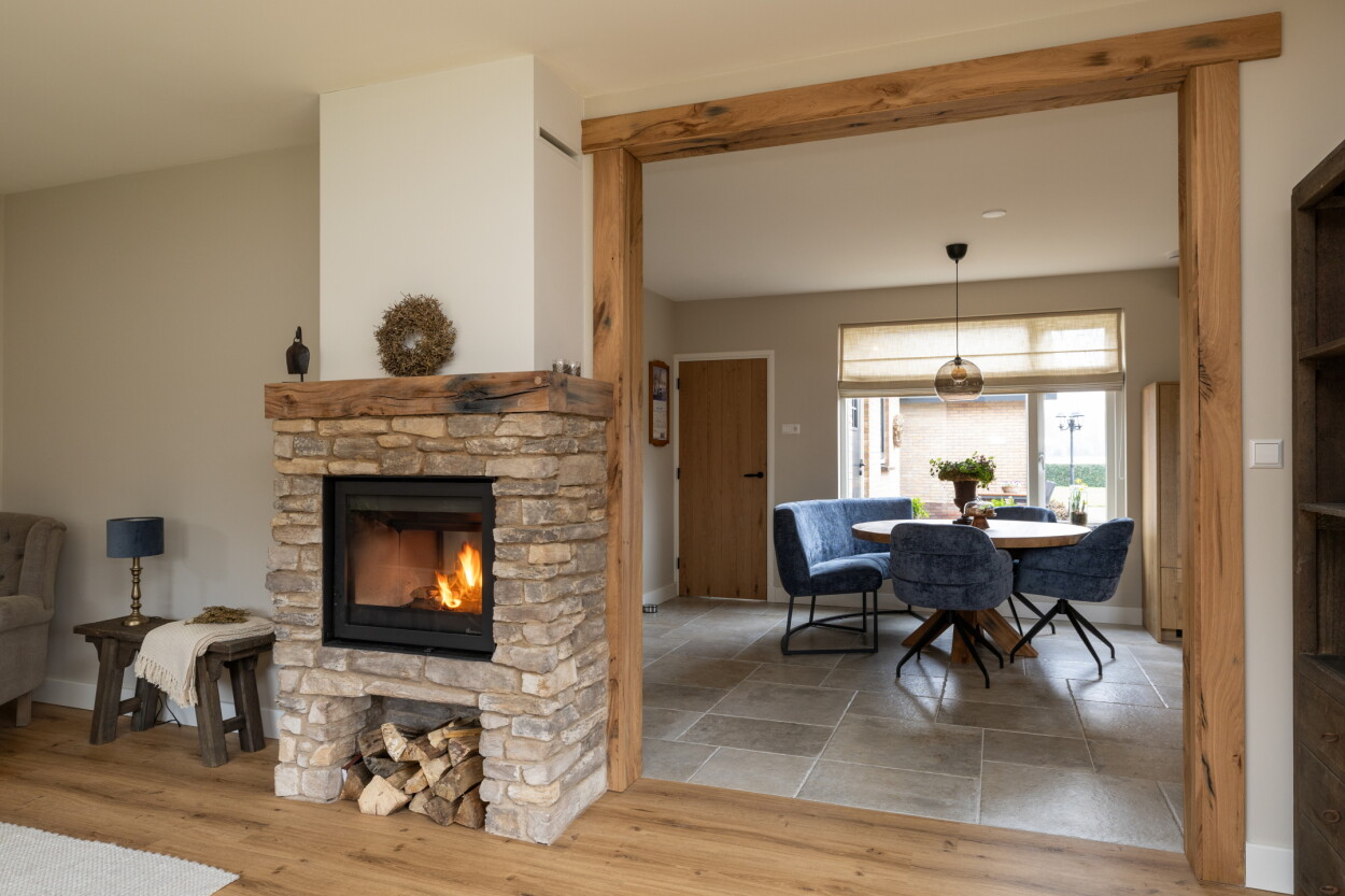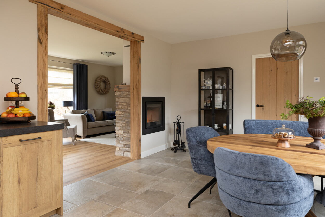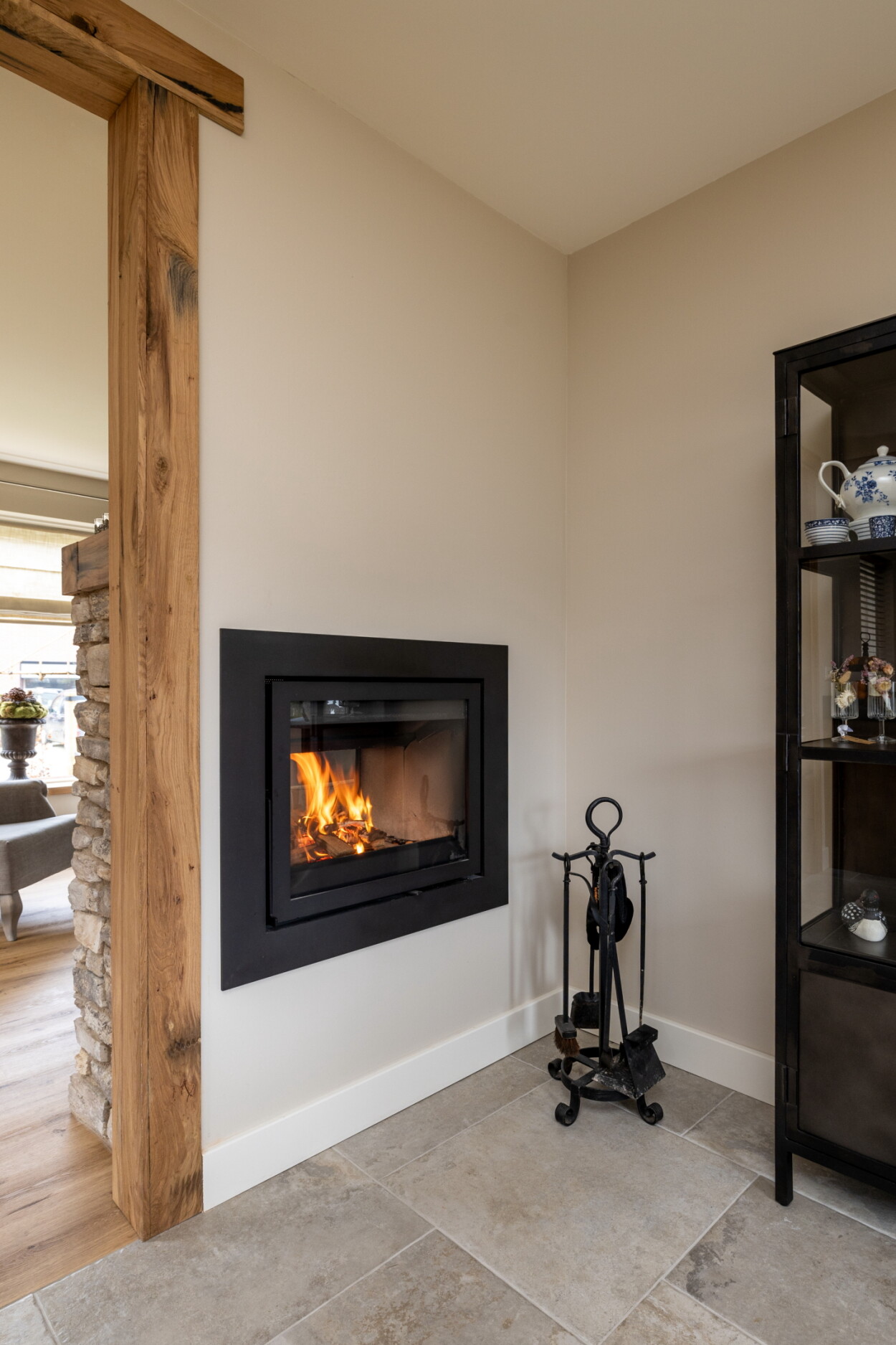 Vanuit de entree aan de rechterzijde is via de hal toegang tot de riante woonkeuken die nog maar net vernieuwd is. De woonkeuken is uitgebouwd en vormt het kloppend hart van het huis. Naast de moderne hoekopstelling is er volop ruimte voor een royale eethoek. De keuken (nog geen jaar oud!) is voorzien van alle wenselijke inbouwapparatuur: vaatwasser, inductiekookplaat, koelkast, stoomoven, magnetron, oven, warmhoudlade en een Quooker-kraan. De afwerking is hoogwaardig, met gestuukte plafonds, eiken deuren en een fraaie tegelvloer in lichte kleurstelling met vloerverwarming. Vanuit de keuken geniet u van een prachtig uitzicht over de landerijen. Via een brede doorgang met eiken balken en een sfeervolle doorkijkhaard bereikt u de woonkamer aan de voorzijde. Ook hier is de afwerking strak en verzorgd, met lichte kleuren, eiken vensterbanken en fraaie flagstones rondom de houthaard. Dankzij de grote raampartijen valt er veel daglicht binnen, wat zorgt voor een aangename en warme sfeer. Vanuit de hal zijn het vernieuwde toilet, de vernieuwde meterkast en de nieuwe houten trap naar de verdieping bereikbaar.