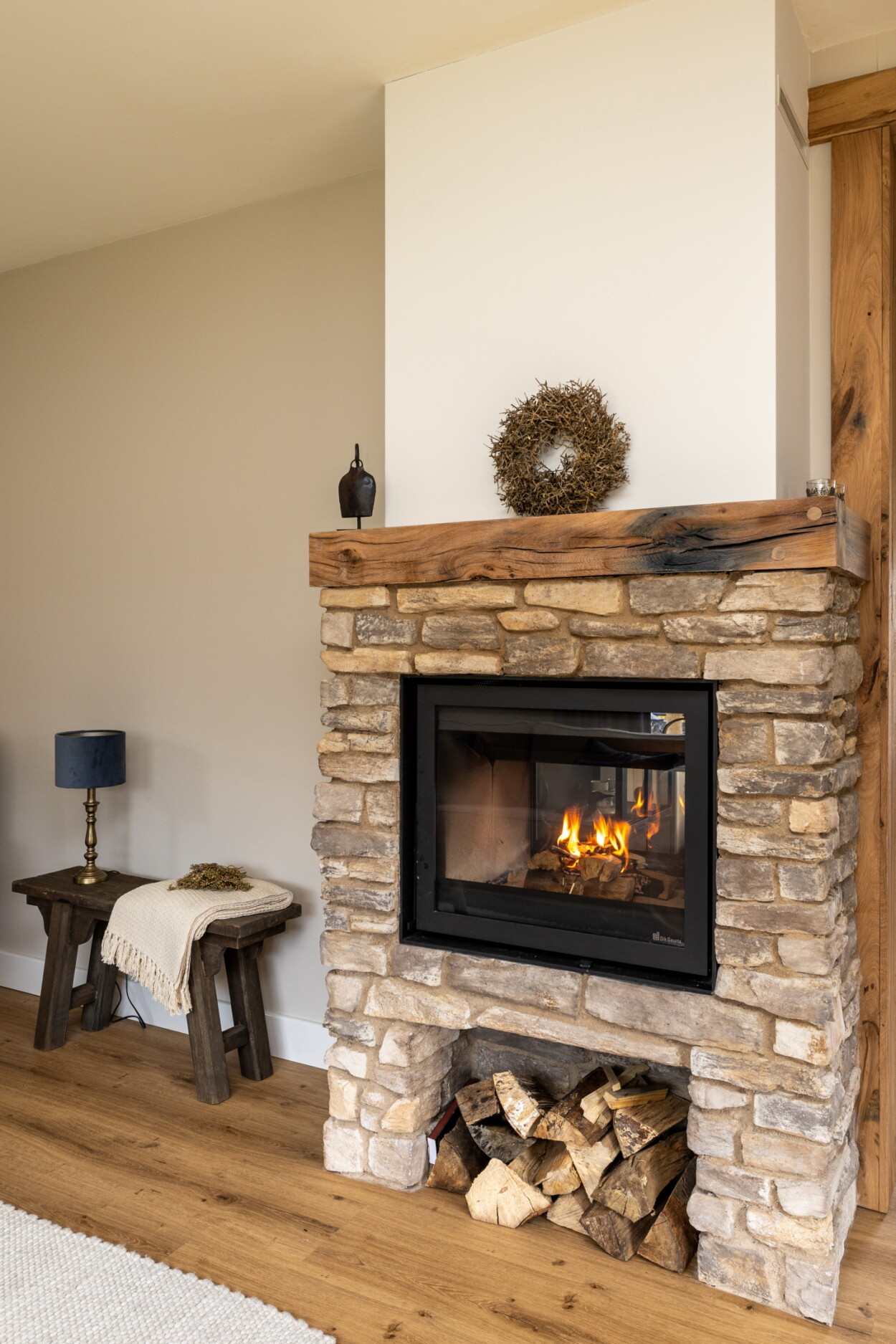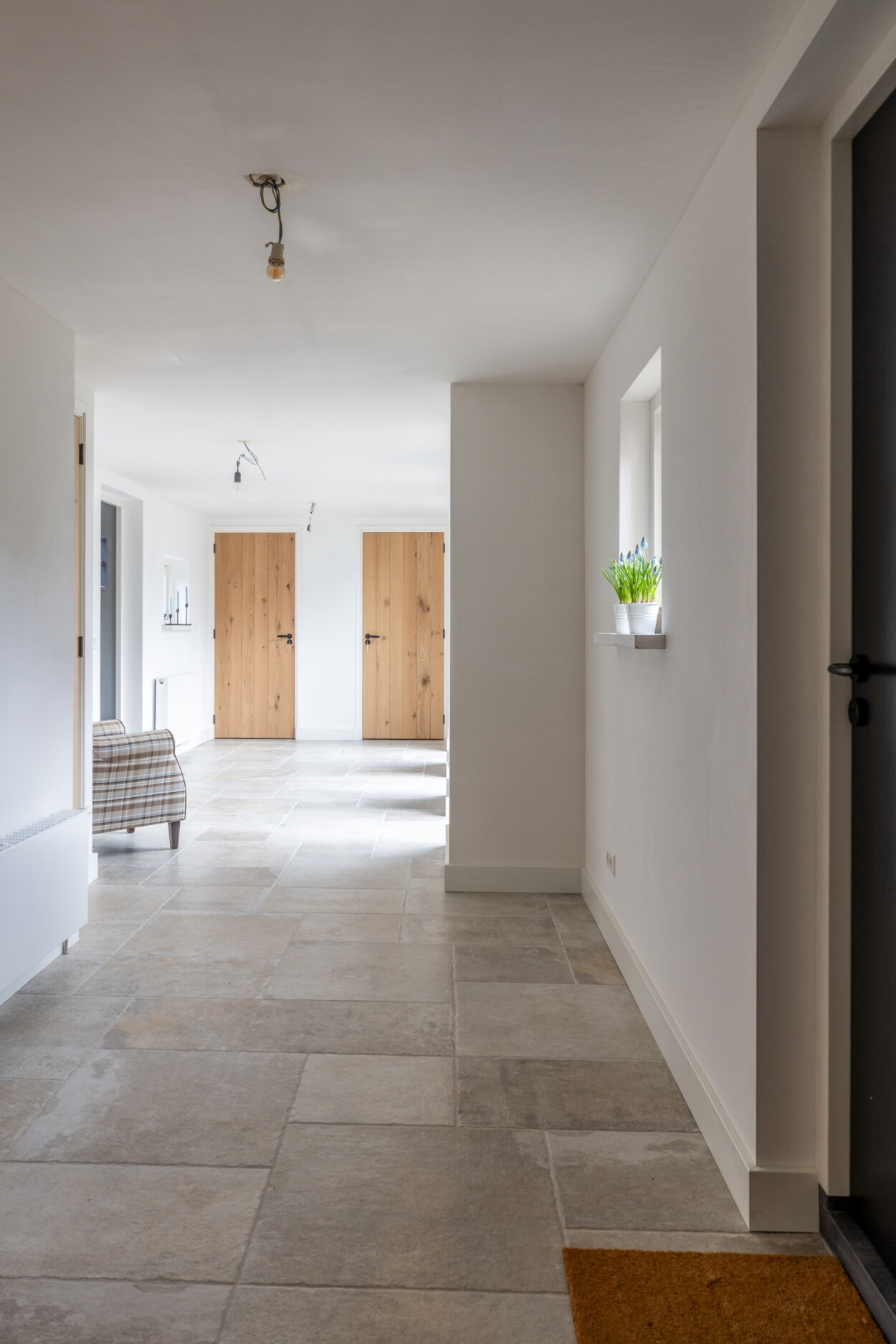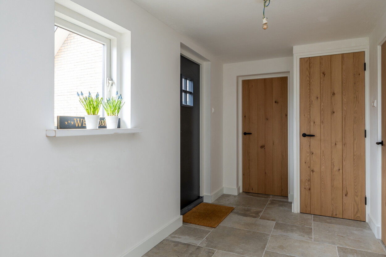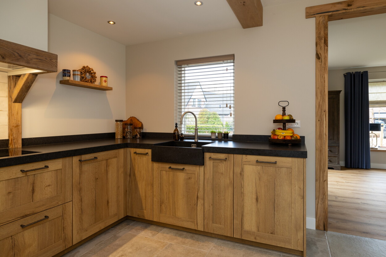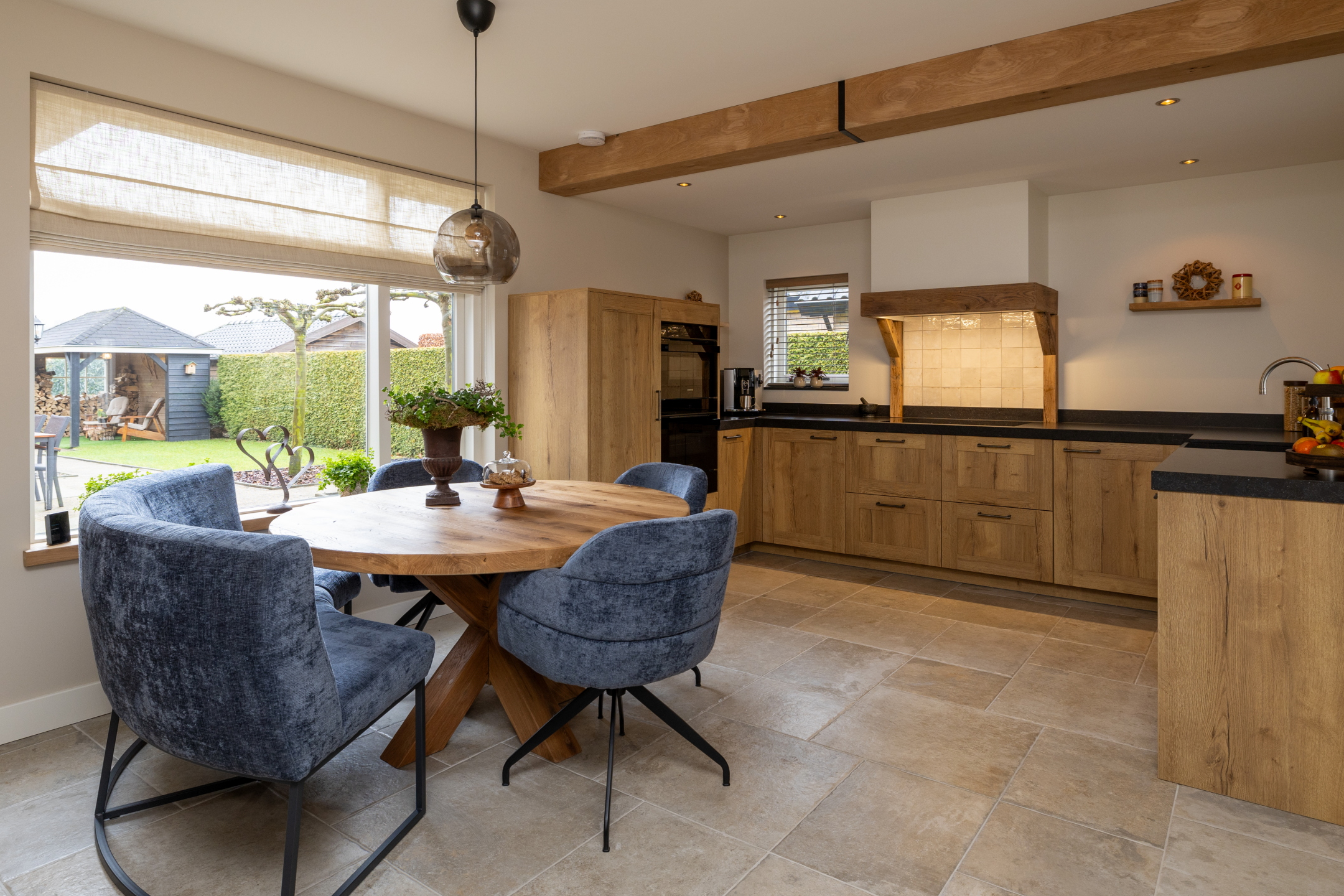 Vanuit de entree aan de rechterzijde is via de hal toegang tot de riante woonkeuken die nog maar net vernieuwd is. De woonkeuken is uitgebouwd en vormt het kloppend hart van het huis. Naast de moderne hoekopstelling is er volop ruimte voor een royale eethoek. De keuken (nog geen jaar oud!) is voorzien van alle wenselijke inbouwapparatuur: vaatwasser, inductiekookplaat, koelkast, stoomoven, magnetron, oven, warmhoudlade en een Quooker-kraan. De afwerking is hoogwaardig, met gestuukte plafonds, eiken deuren en een fraaie tegelvloer in lichte kleurstelling met vloerverwarming. Vanuit de keuken geniet u van een prachtig uitzicht over de landerijen. Via een brede doorgang met eiken balken en een sfeervolle doorkijkhaard bereikt u de woonkamer aan de voorzijde. Ook hier is de afwerking strak en verzorgd, met lichte kleuren, eiken vensterbanken en fraaie flagstones rondom de houthaard. Dankzij de grote raampartijen valt er veel daglicht binnen, wat zorgt voor een aangename en warme sfeer. Vanuit de hal zijn het vernieuwde toilet, de vernieuwde meterkast en de nieuwe houten trap naar de verdieping bereikbaar.