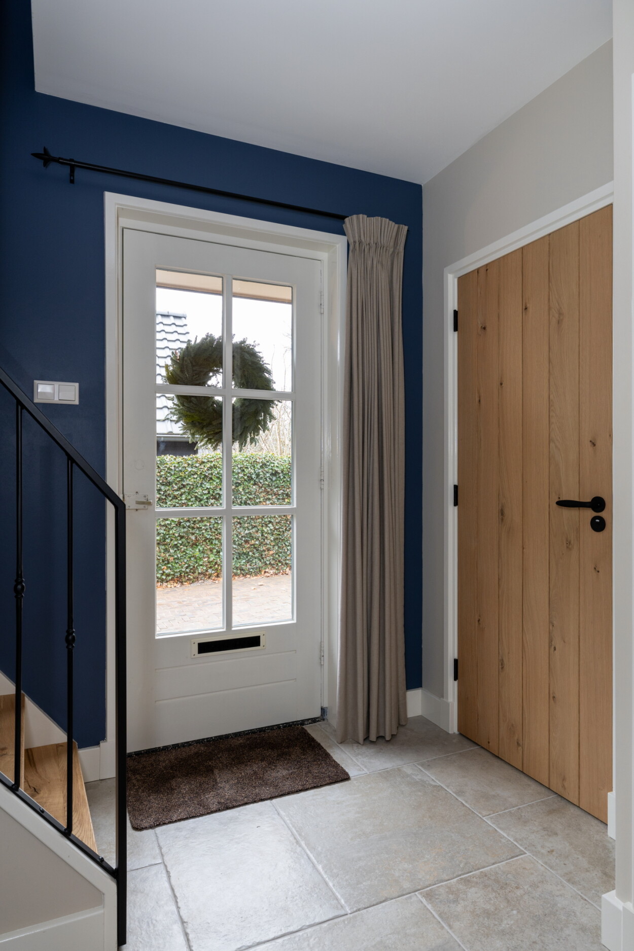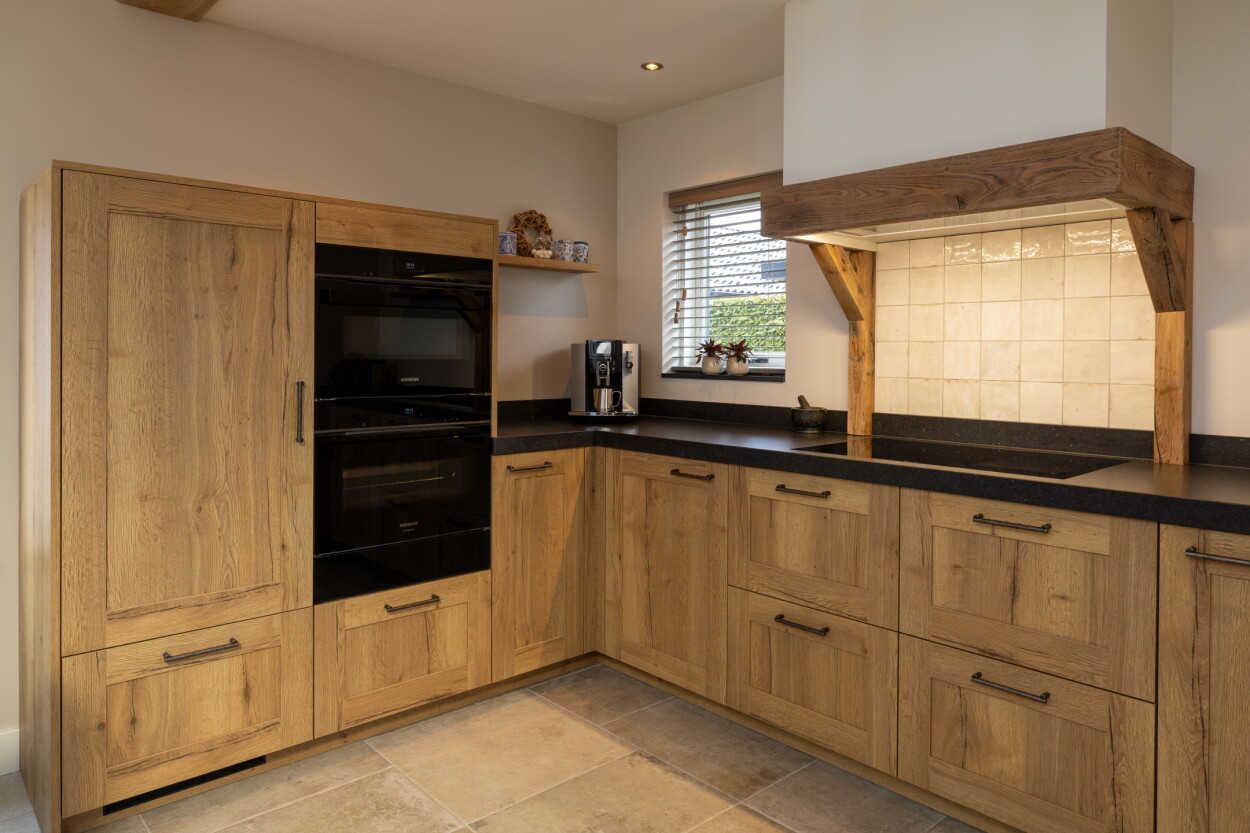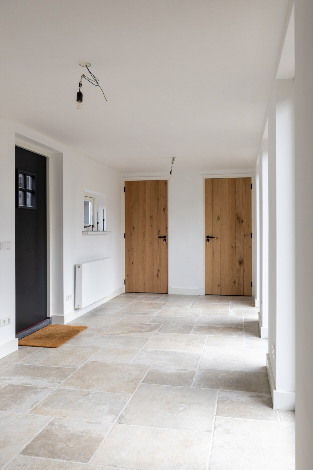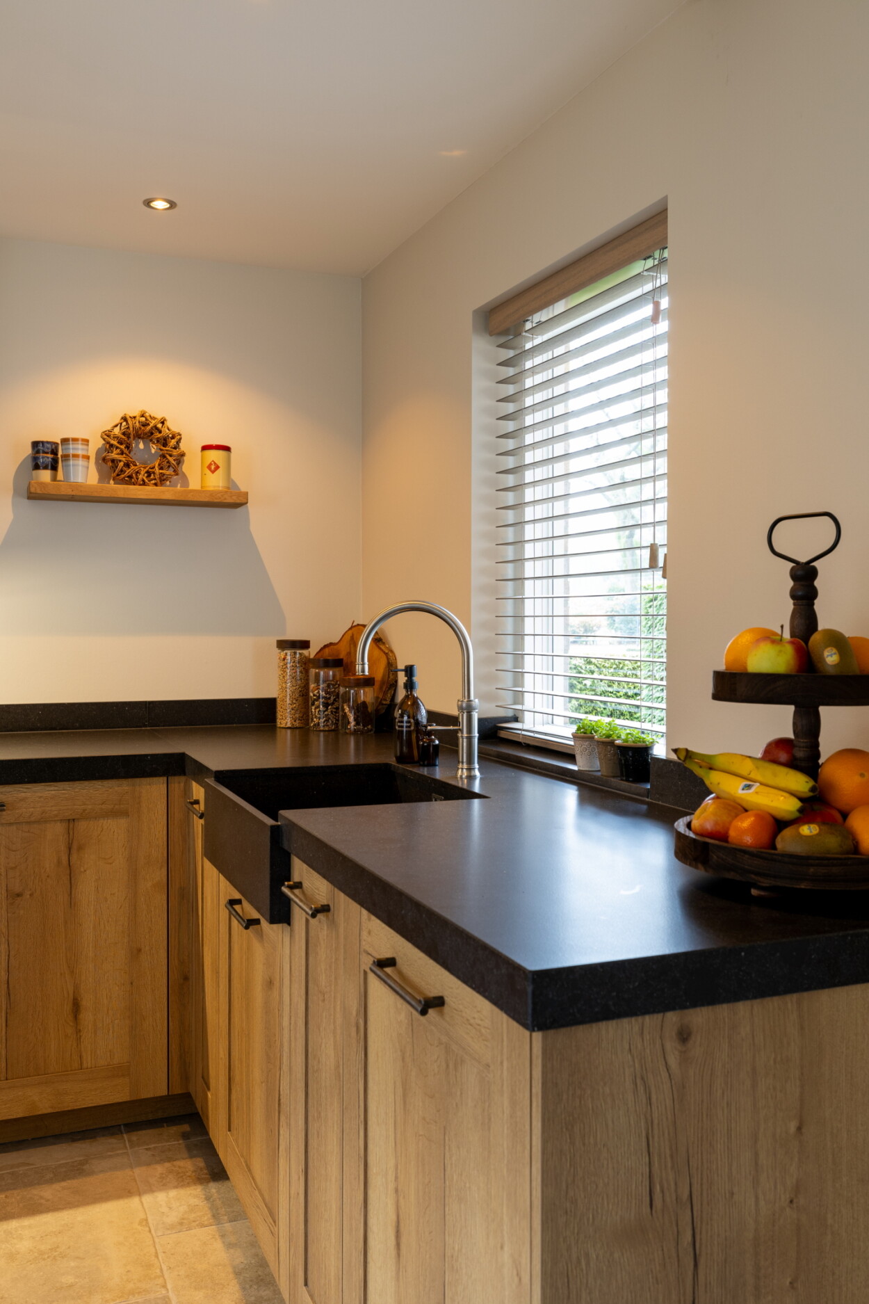 Vanuit de entree aan de rechterzijde is via de hal toegang tot de riante woonkeuken die nog maar net vernieuwd is. De woonkeuken is uitgebouwd en vormt het kloppend hart van het huis. Naast de moderne hoekopstelling is er volop ruimte voor een royale eethoek. De keuken (nog geen jaar oud!) is voorzien van alle wenselijke inbouwapparatuur: vaatwasser, inductiekookplaat, koelkast, stoomoven, magnetron, oven, warmhoudlade en een Quooker-kraan. De afwerking is hoogwaardig, met gestuukte plafonds, eiken deuren en een fraaie tegelvloer in lichte kleurstelling met vloerverwarming. Vanuit de keuken geniet u van een prachtig uitzicht over de landerijen. Via een brede doorgang met eiken balken en een sfeervolle doorkijkhaard bereikt u de woonkamer aan de voorzijde. Ook hier is de afwerking strak en verzorgd, met lichte kleuren, eiken vensterbanken en fraaie flagstones rondom de houthaard. Dankzij de grote raampartijen valt er veel daglicht binnen, wat zorgt voor een aangename en warme sfeer. Vanuit de hal zijn het vernieuwde toilet, de vernieuwde meterkast en de nieuwe houten trap naar de verdieping bereikbaar.