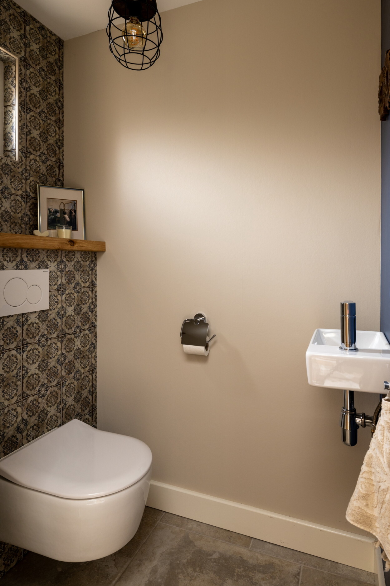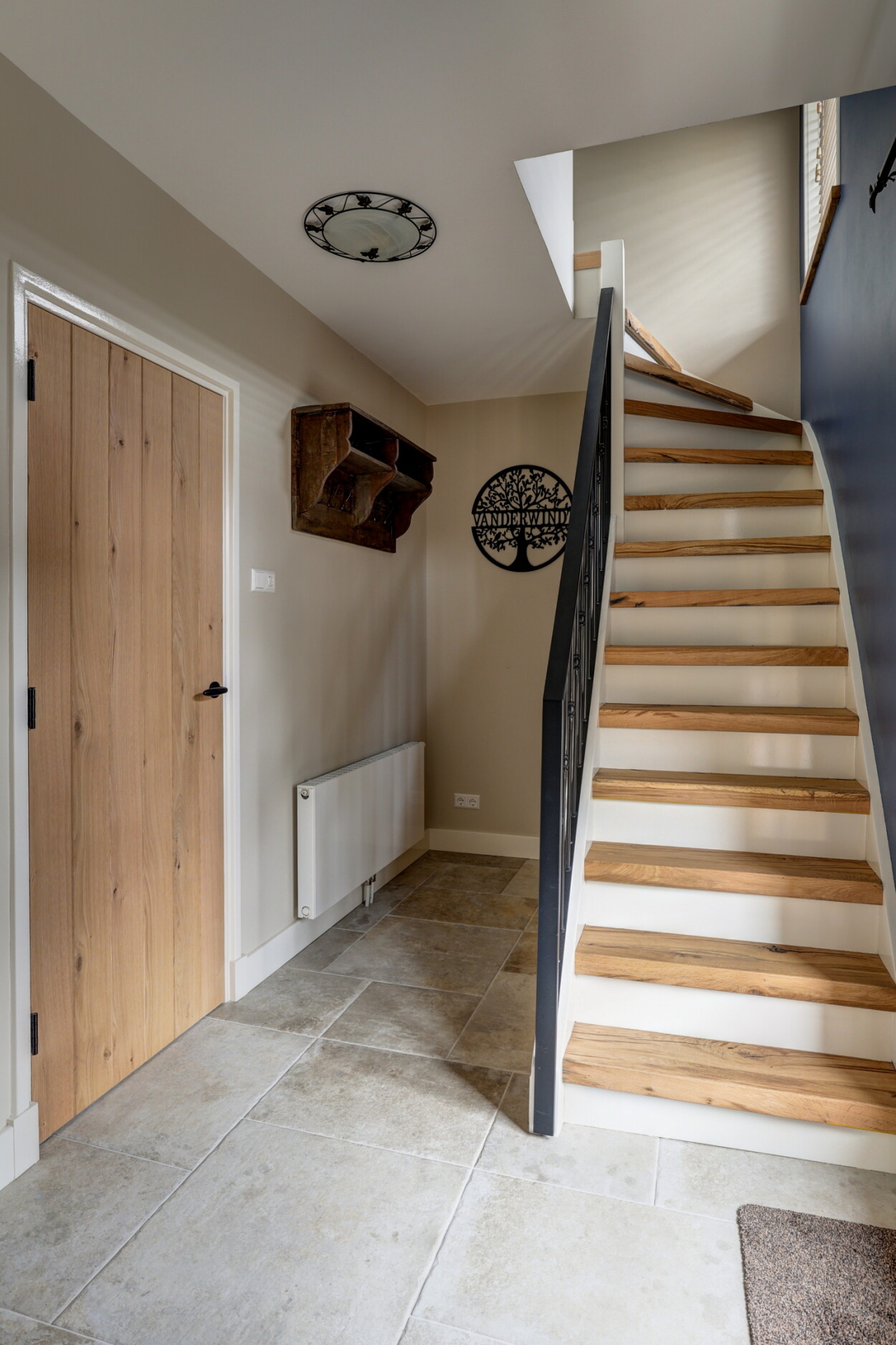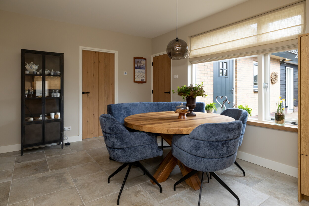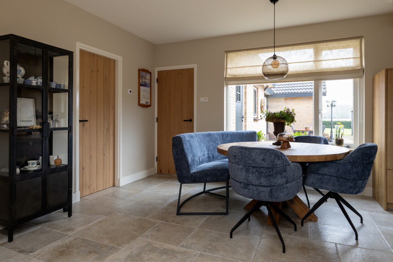 Vanuit de entree aan de rechterzijde is via de hal toegang tot de riante woonkeuken die nog maar net vernieuwd is. De woonkeuken is uitgebouwd en vormt het kloppend hart van het huis. Naast de moderne hoekopstelling is er volop ruimte voor een royale eethoek. De keuken (nog geen jaar oud!) is voorzien van alle wenselijke inbouwapparatuur: vaatwasser, inductiekookplaat, koelkast, stoomoven, magnetron, oven, warmhoudlade en een Quooker-kraan. De afwerking is hoogwaardig, met gestuukte plafonds, eiken deuren en een fraaie tegelvloer in lichte kleurstelling met vloerverwarming. Vanuit de keuken geniet u van een prachtig uitzicht over de landerijen. Via een brede doorgang met eiken balken en een sfeervolle doorkijkhaard bereikt u de woonkamer aan de voorzijde. Ook hier is de afwerking strak en verzorgd, met lichte kleuren, eiken vensterbanken en fraaie flagstones rondom de houthaard. Dankzij de grote raampartijen valt er veel daglicht binnen, wat zorgt voor een aangename en warme sfeer. Vanuit de hal zijn het vernieuwde toilet, de vernieuwde meterkast en de nieuwe houten trap naar de verdieping bereikbaar.