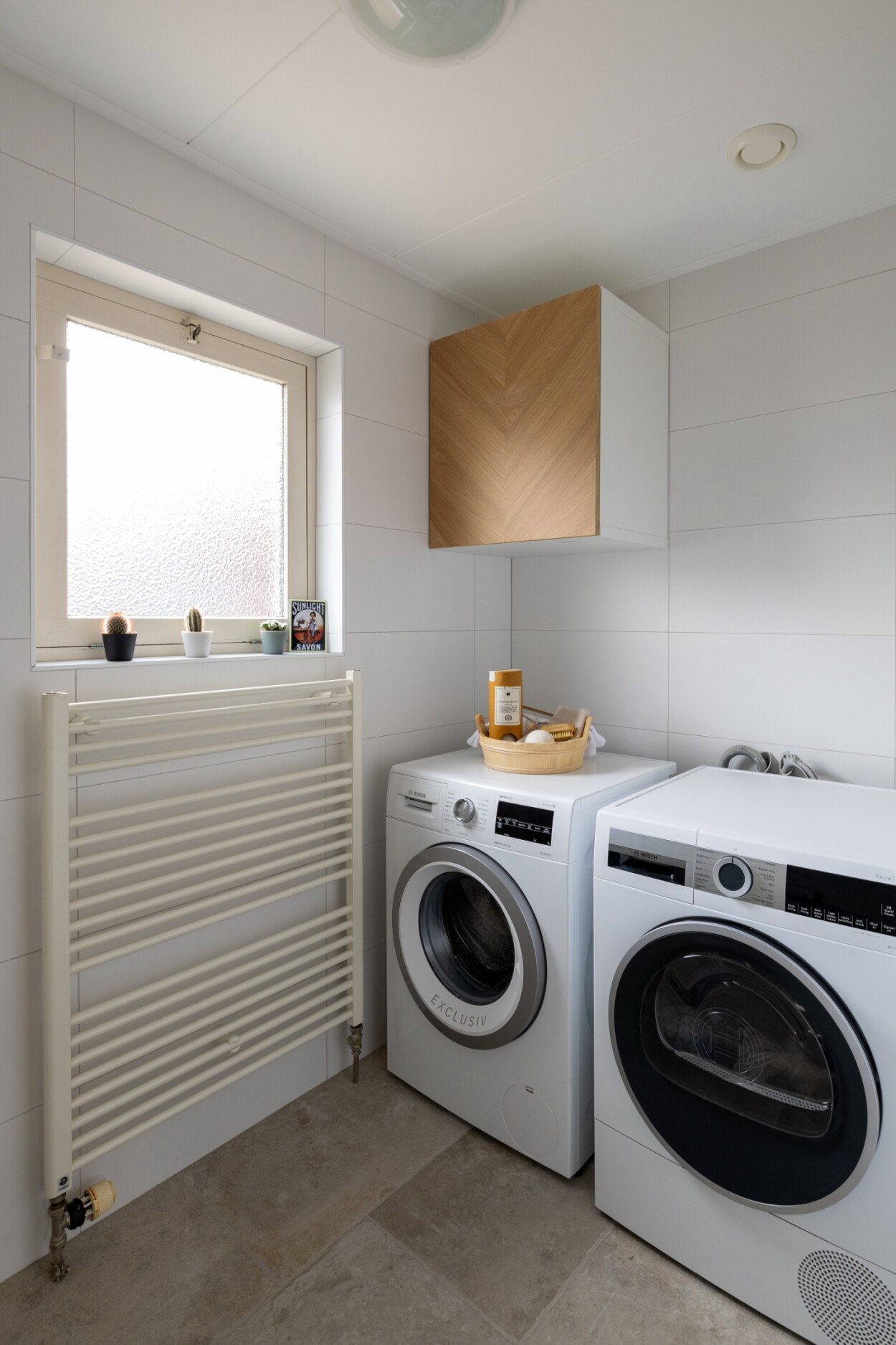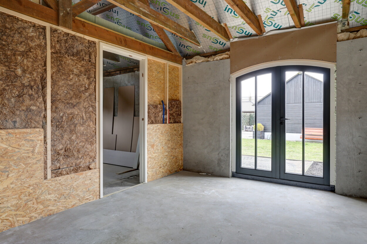 Bij binnenkomst via nieuw aangebouwde entree aan de zijkant, komt u allereerst in een hele lichte en strak afgewerkte ruimte met cv- ruimte, witgoedruimte en een ingebouwde kast. Aan de linkerzijde is de voormalige garage al deels omgebouwd en ingedeeld in een drietal ruimtes die casco afgewerkt zijn en voorzien van dubbele tuindeuren. De bedoeling was om hier twee slaapkamers en een badkamer te realiseren, waarvoor reeds aansluitingen aanwezig zijn.