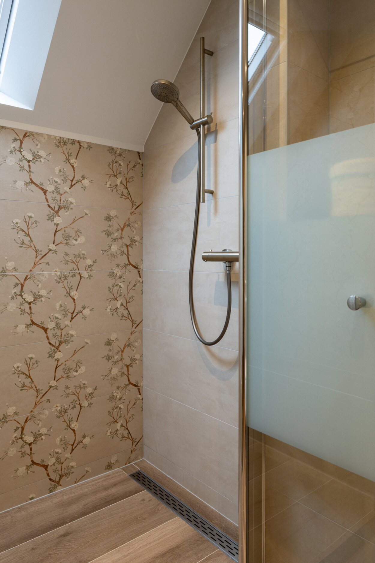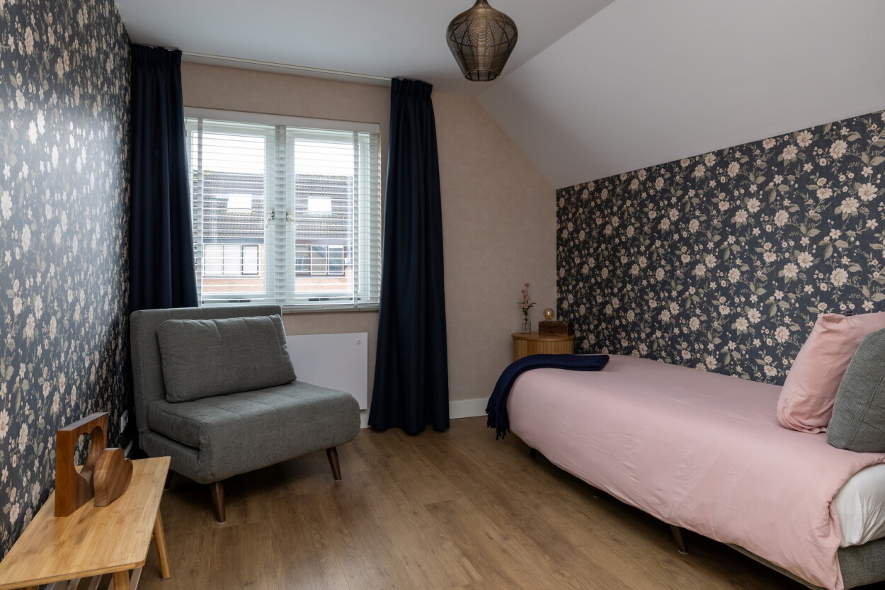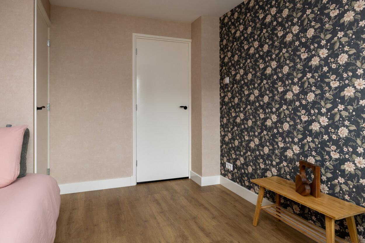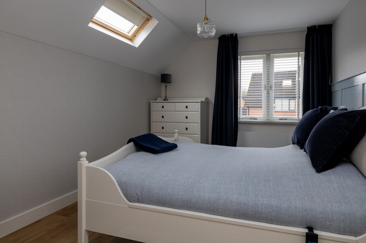 Vanaf de overloop zijn alle vertrekken toegankelijk. Ook hier zijn de wanden en plafonds strak gestuukt en gaat de neutrale en hoogwaardige afwerking door. Aan de voorzijde bevinden zich twee slaapkamers, beide met vaste kasten; één kamer beschikt over een dakvenster voor extra lichtinval. Aan de achterzijde ligt de ruime slaapkamer, eveneens voorzien van een dakvenster en met een prachtig uitzicht. De badkamer is in 2025 compleet vernieuwd en uitgerust met een wastafel, toilet, ruime douchehoek en vloerverwarming. Via een vlizotrap op de overloop is de ruime bergzolder over de gehele diepte van de woning bereikbaar.