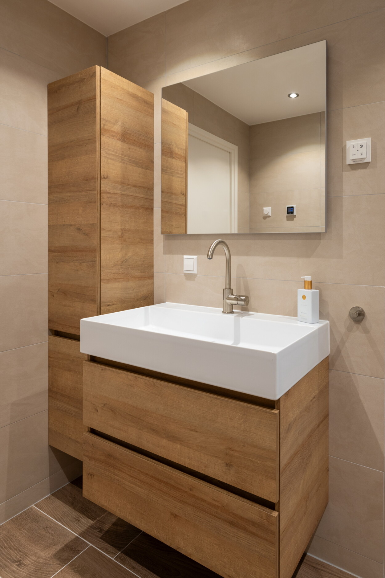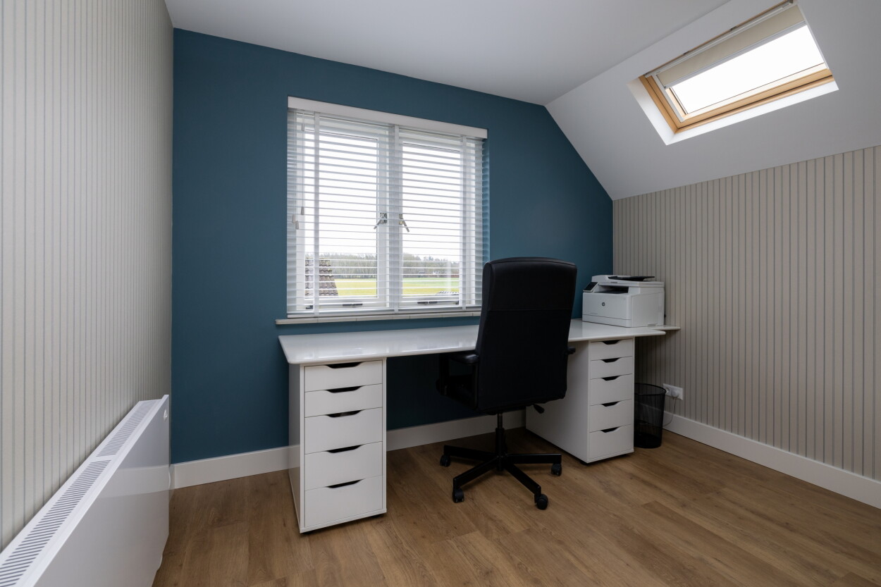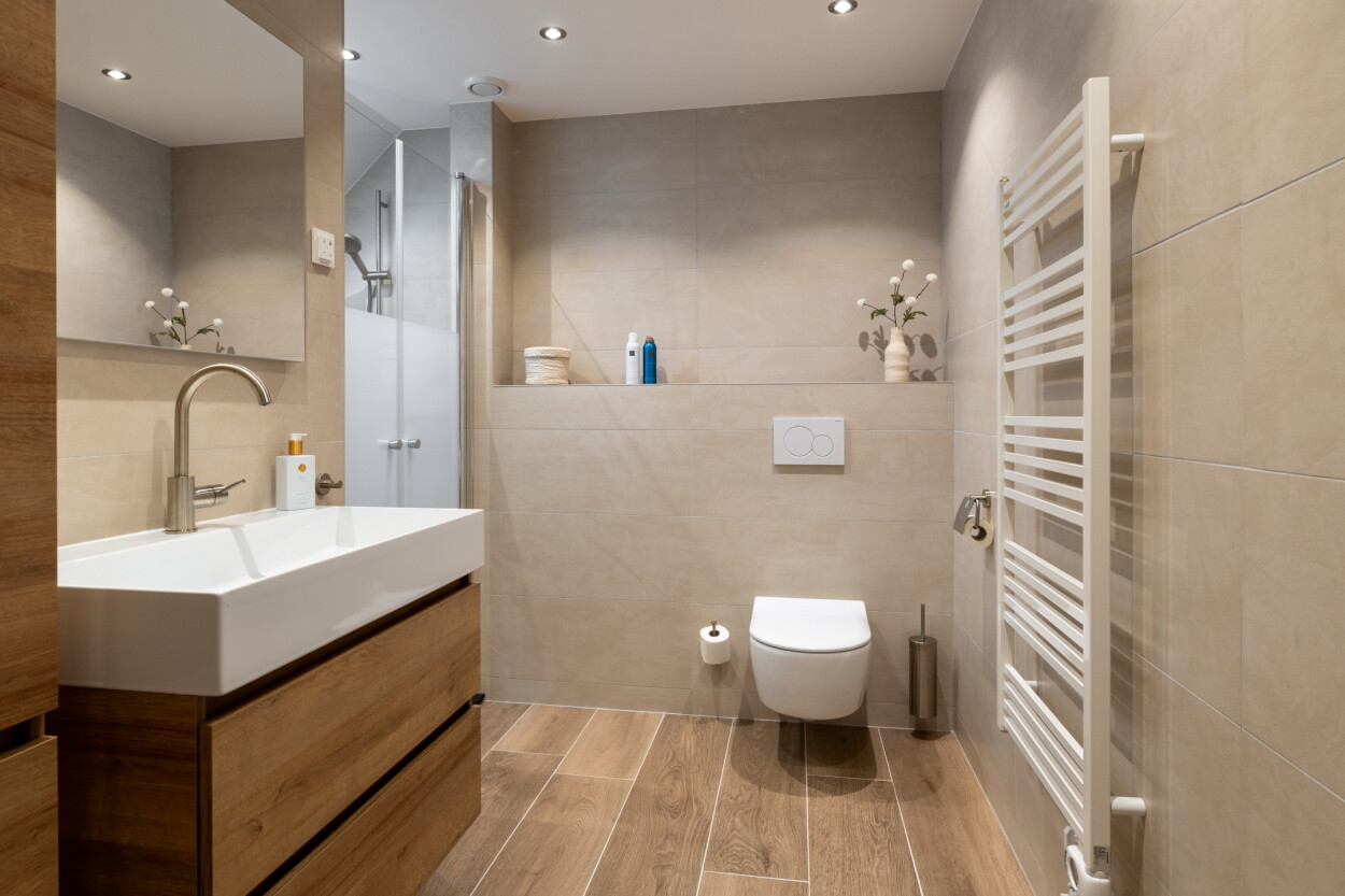 Vanaf de overloop zijn alle vertrekken toegankelijk. Ook hier zijn de wanden en plafonds strak gestuukt en gaat de neutrale en hoogwaardige afwerking door. Aan de voorzijde bevinden zich twee slaapkamers, beide met vaste kasten; één kamer beschikt over een dakvenster voor extra lichtinval. Aan de achterzijde ligt de ruime slaapkamer, eveneens voorzien van een dakvenster en met een prachtig uitzicht. De badkamer is in 2025 compleet vernieuwd en uitgerust met een wastafel, toilet, ruime douchehoek en vloerverwarming. Via een vlizotrap op de overloop is de ruime bergzolder over de gehele diepte van de woning bereikbaar.