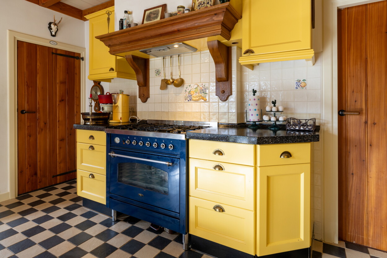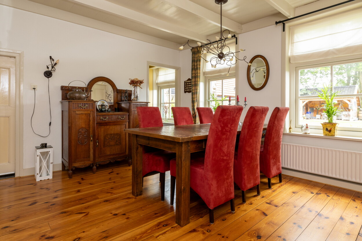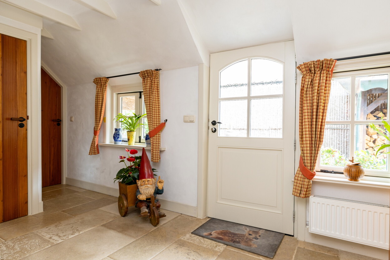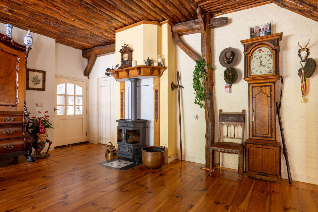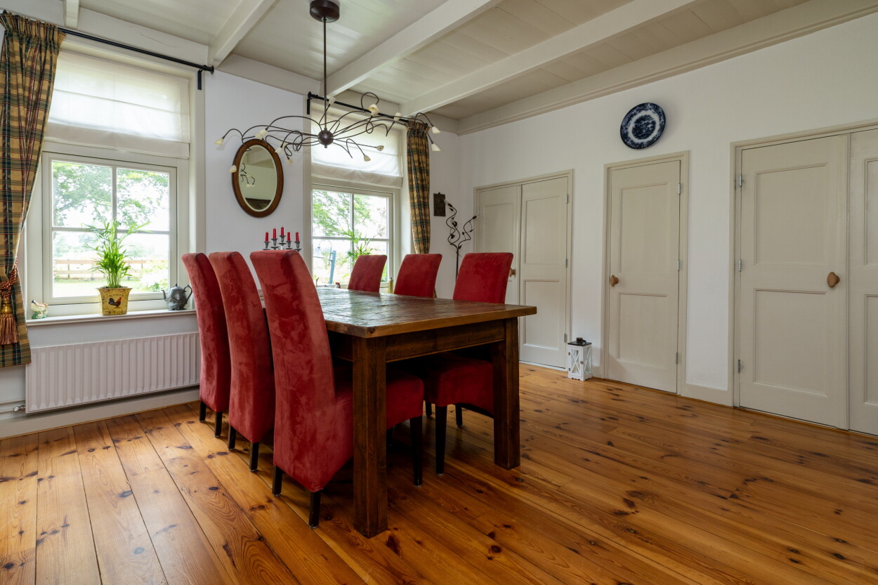 Bij binnenkomst via de officiële entree aan de zijkant komt u allereerst in de hal. Vanuit de hal is er toegang tot de woonkamer, de kelder onder de opkamer, een toiletruimte en de badkamer. Tevens treft u er de trappartij naar de verdieping. Allereerst de woonkamer. Deze is aan de voorzijde gelegen en betreft de voormalige deel. De ruimte is heel karakteristiek uitgevoerd met een houten balkenplafond. De oude staldeuren zijn vervangen door raampartijen. Centraal is er een houtkachelopstelling. Zowel vanuit de woonkamer als de hal is de eetkamer te bereiken. Deze is aan de achterzijde gelegen en betreft een ruimte met veel authentieke details. Zo treft u hier ook een heel fraai plafond, zijn de oude bedstedes terug te vinden en is er een haardpartij met tegelplateau te vinden. Tevens is vanuit hier ook de opkamer toegankelijk. Tenslotte is vanuit de hal nog de badkamer te bereiken. Zowel de hal als de badkamer zijn voorzien van vloerverwarming. De badkamer zelf beschikt over een riant wastafelmeubel met dubbele vaste wastafel en een inloopdouche. Vanuit de woonkamer is vervolgens de woonkeuken te bereiken. Hier is een landelijke keukenopstelling geplaatst en beschikt over diverse inbouwapparatuur, waaronder een gasfornuis met oven, vaatwasser, koelkast en afzuigkap. In de woonkeuken zijn tevens openslaande deuren naar de achtertuin te vinden. Vervolgens is er vanuit de woonkeuken nog toegang tot de slaapkamer.