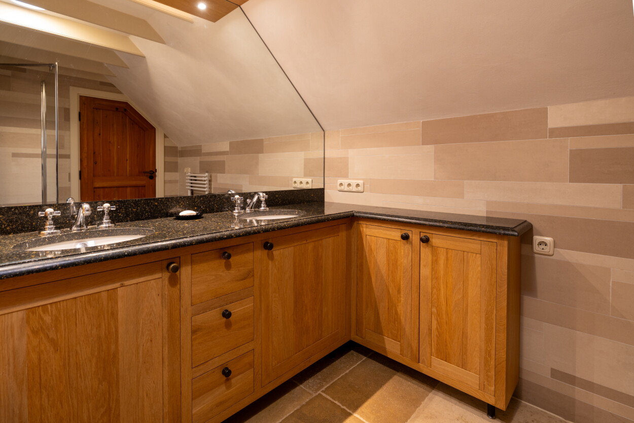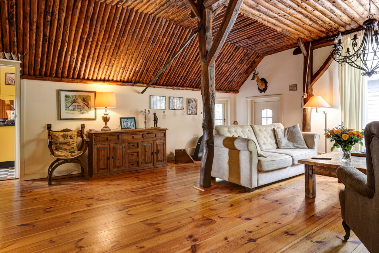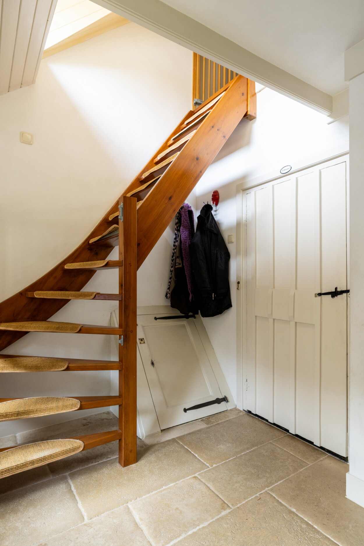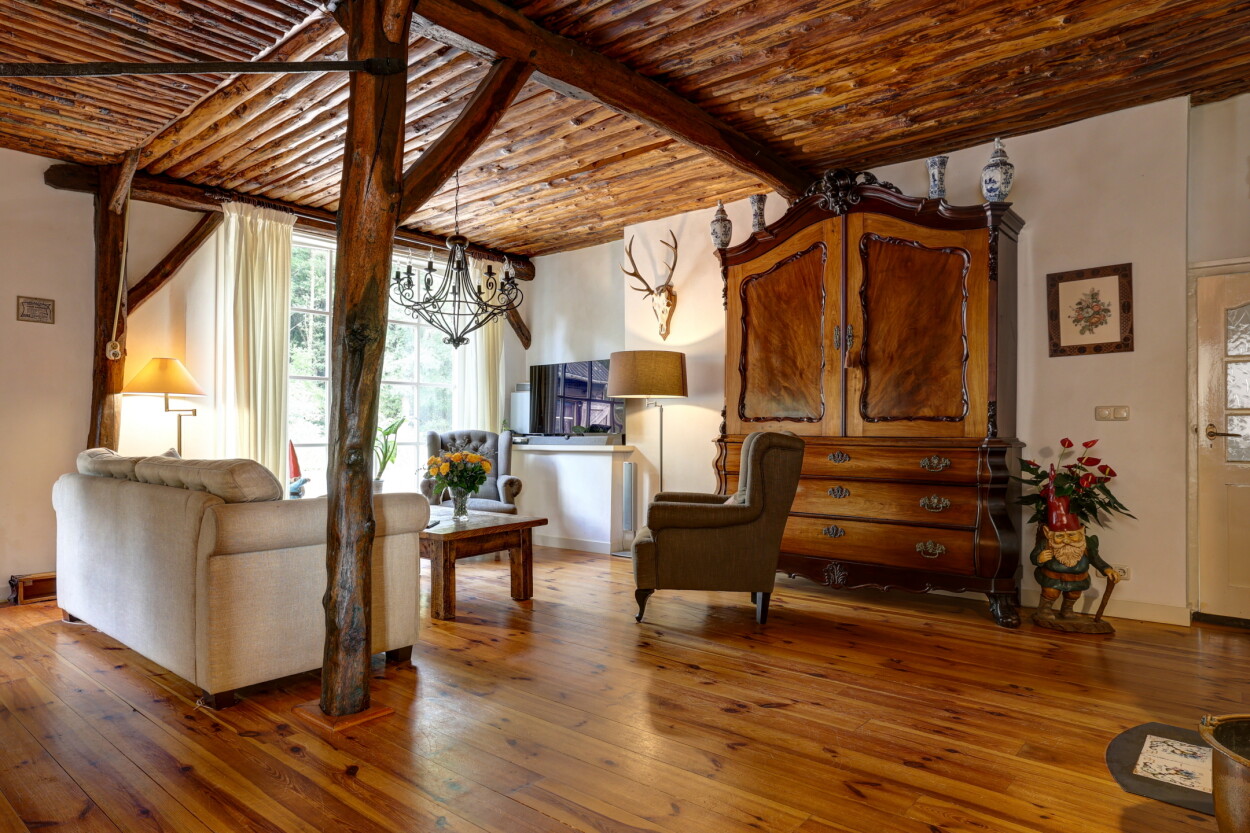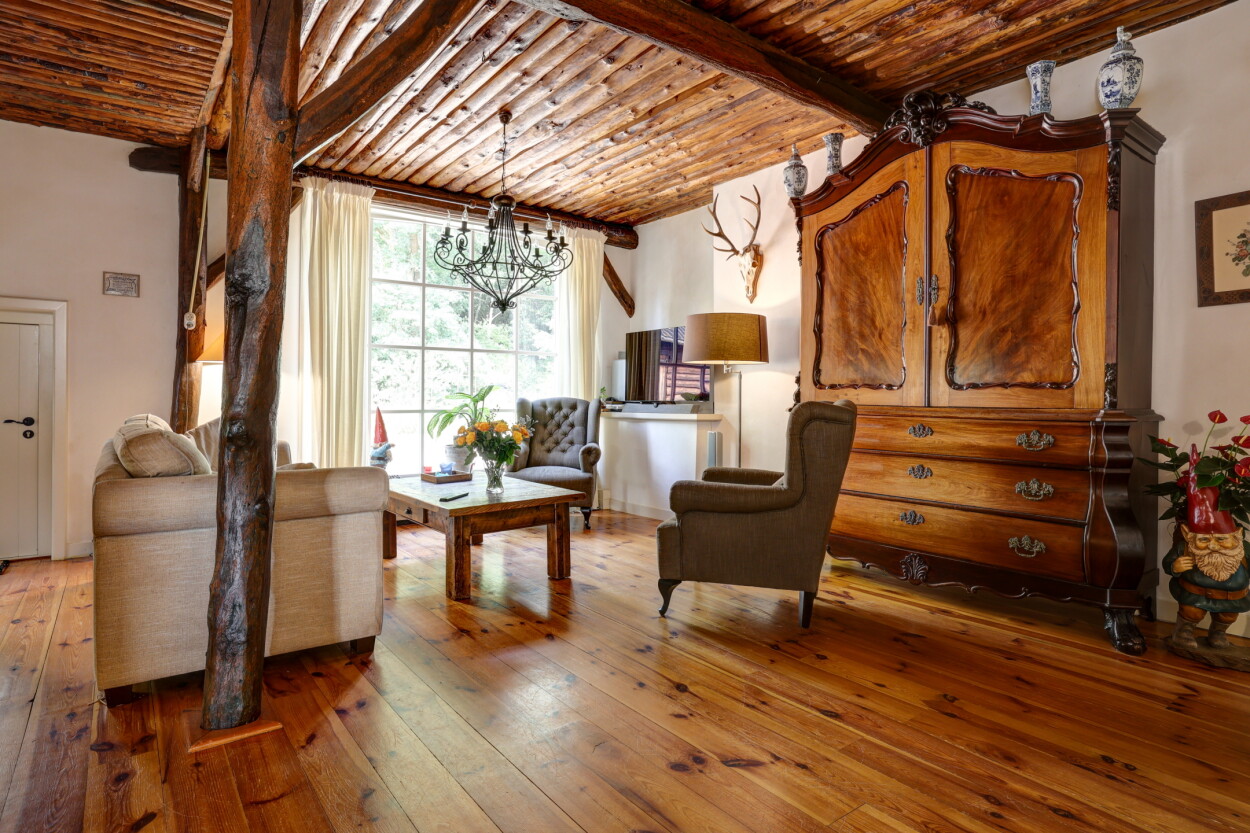 Bij binnenkomst via de officiële entree aan de zijkant komt u allereerst in de hal. Vanuit de hal is er toegang tot de woonkamer, de kelder onder de opkamer, een toiletruimte en de badkamer. Tevens treft u er de trappartij naar de verdieping. Allereerst de woonkamer. Deze is aan de voorzijde gelegen en betreft de voormalige deel. De ruimte is heel karakteristiek uitgevoerd met een houten balkenplafond. De oude staldeuren zijn vervangen door raampartijen. Centraal is er een houtkachelopstelling. Zowel vanuit de woonkamer als de hal is de eetkamer te bereiken. Deze is aan de achterzijde gelegen en betreft een ruimte met veel authentieke details. Zo treft u hier ook een heel fraai plafond, zijn de oude bedstedes terug te vinden en is er een haardpartij met tegelplateau te vinden. Tevens is vanuit hier ook de opkamer toegankelijk. Tenslotte is vanuit de hal nog de badkamer te bereiken. Zowel de hal als de badkamer zijn voorzien van vloerverwarming. De badkamer zelf beschikt over een riant wastafelmeubel met dubbele vaste wastafel en een inloopdouche. Vanuit de woonkamer is vervolgens de woonkeuken te bereiken. Hier is een landelijke keukenopstelling geplaatst en beschikt over diverse inbouwapparatuur, waaronder een gasfornuis met oven, vaatwasser, koelkast en afzuigkap. In de woonkeuken zijn tevens openslaande deuren naar de achtertuin te vinden. Vervolgens is er vanuit de woonkeuken nog toegang tot de slaapkamer.