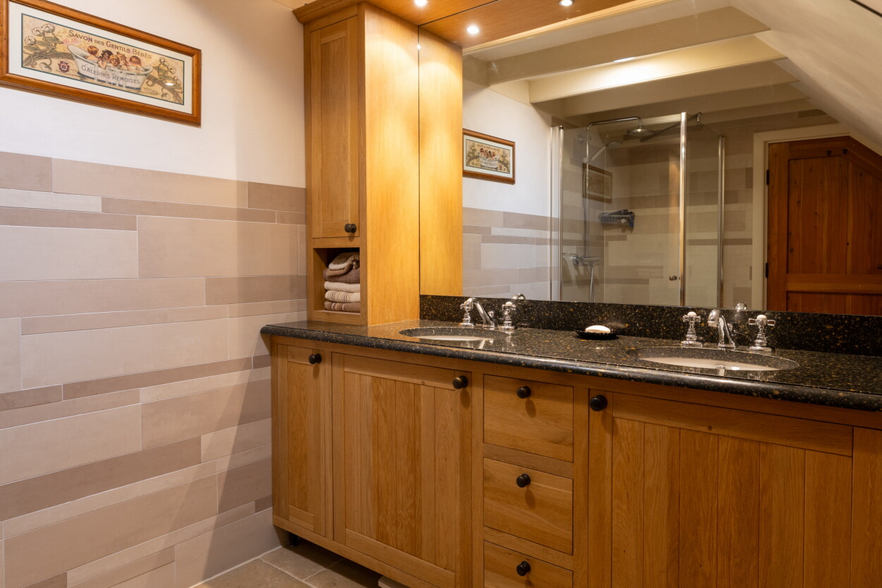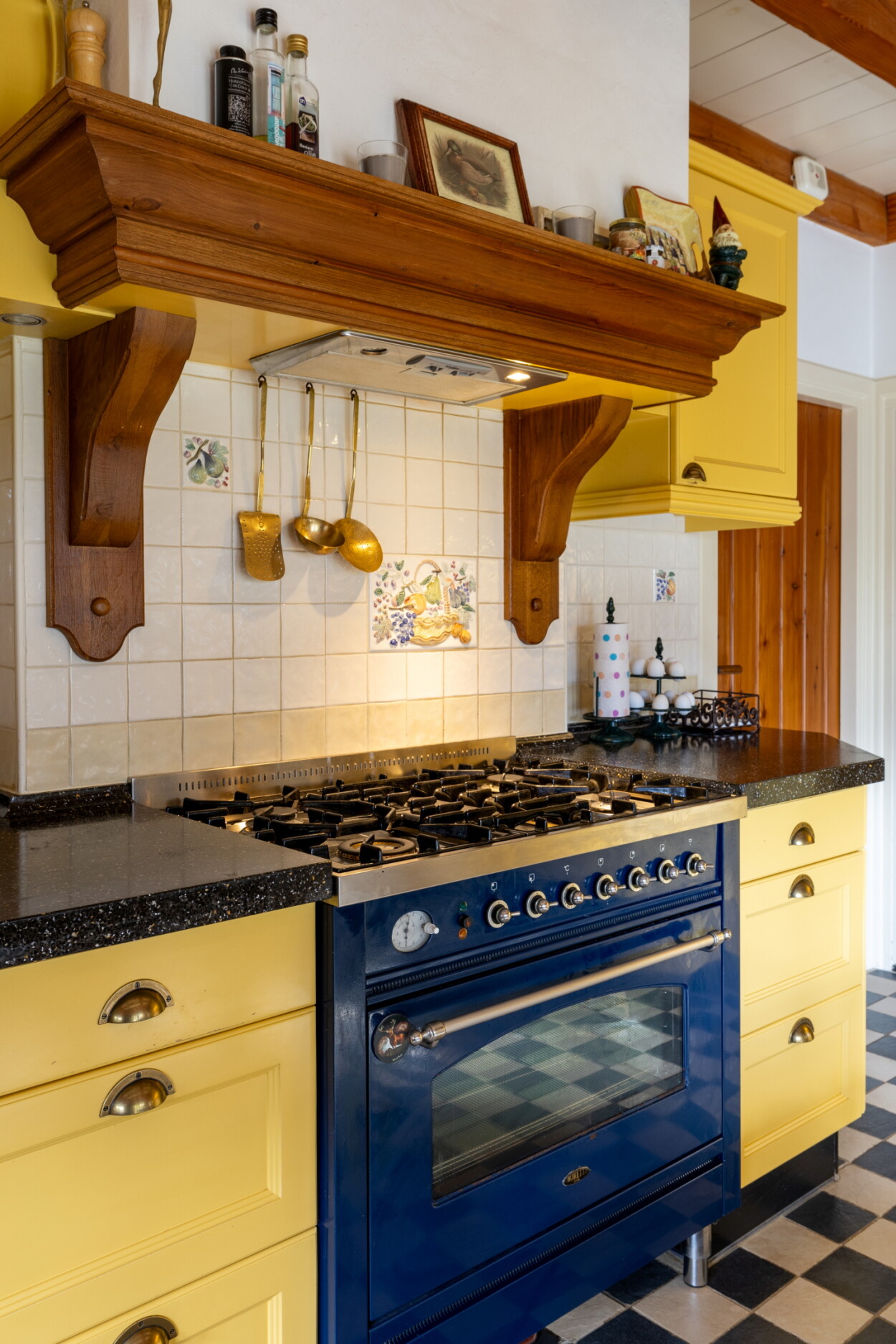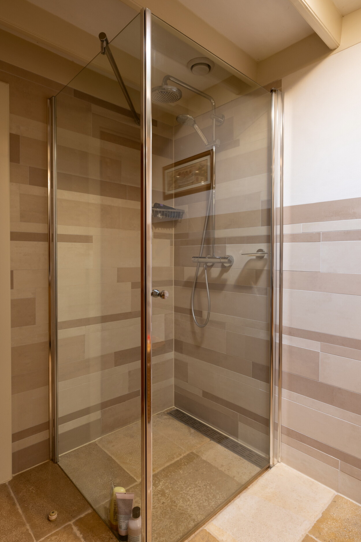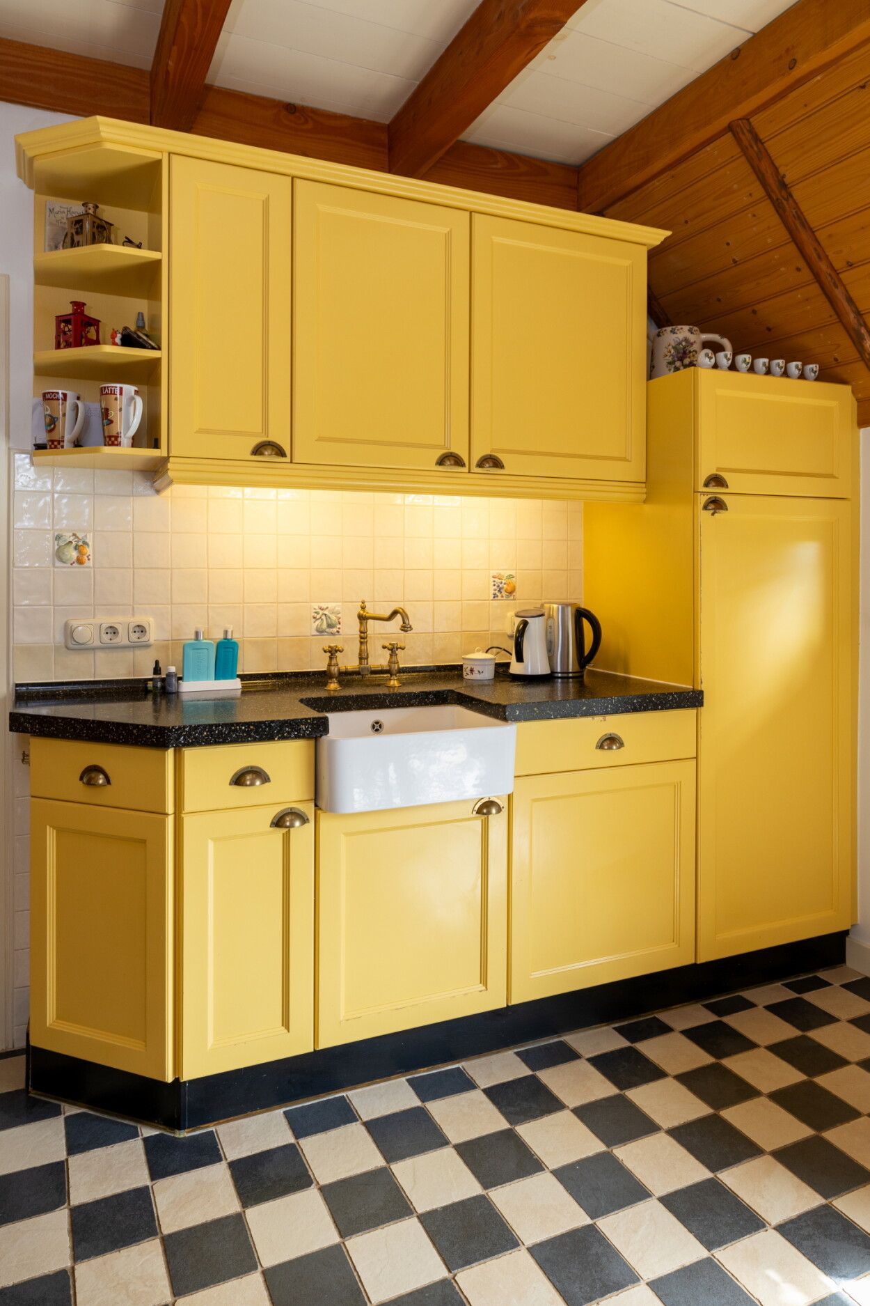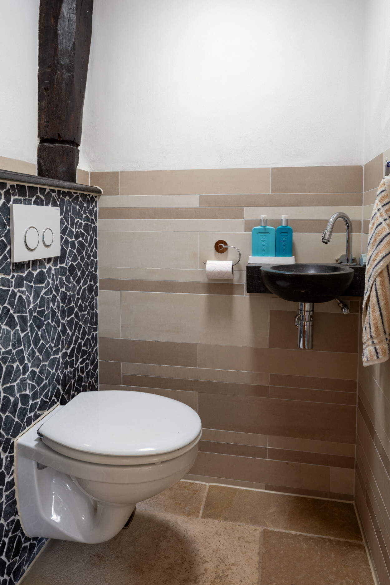Bij binnenkomst via de officiële entree aan de zijkant komt u allereerst in de hal. Vanuit de hal is er toegang tot de woonkamer, de kelder onder de opkamer, een toiletruimte en de badkamer. Tevens treft u er de trappartij naar de verdieping. Allereerst de woonkamer. Deze is aan de voorzijde gelegen en betreft de voormalige deel. De ruimte is heel karakteristiek uitgevoerd met een houten balkenplafond. De oude staldeuren zijn vervangen door raampartijen. Centraal is er een houtkachelopstelling. Zowel vanuit de woonkamer als de hal is de eetkamer te bereiken. Deze is aan de achterzijde gelegen en betreft een ruimte met veel authentieke details. Zo treft u hier ook een heel fraai plafond, zijn de oude bedstedes terug te vinden en is er een haardpartij met tegelplateau te vinden. Tevens is vanuit hier ook de opkamer toegankelijk. Tenslotte is vanuit de hal nog de badkamer te bereiken. Zowel de hal als de badkamer zijn voorzien van vloerverwarming. De badkamer zelf beschikt over een riant wastafelmeubel met dubbele vaste wastafel en een inloopdouche. Vanuit de woonkamer is vervolgens de woonkeuken te bereiken. Hier is een landelijke keukenopstelling geplaatst en beschikt over diverse inbouwapparatuur, waaronder een gasfornuis met oven, vaatwasser, koelkast en afzuigkap. In de woonkeuken zijn tevens openslaande deuren naar de achtertuin te vinden. Vervolgens is er vanuit de woonkeuken nog toegang tot de slaapkamer.