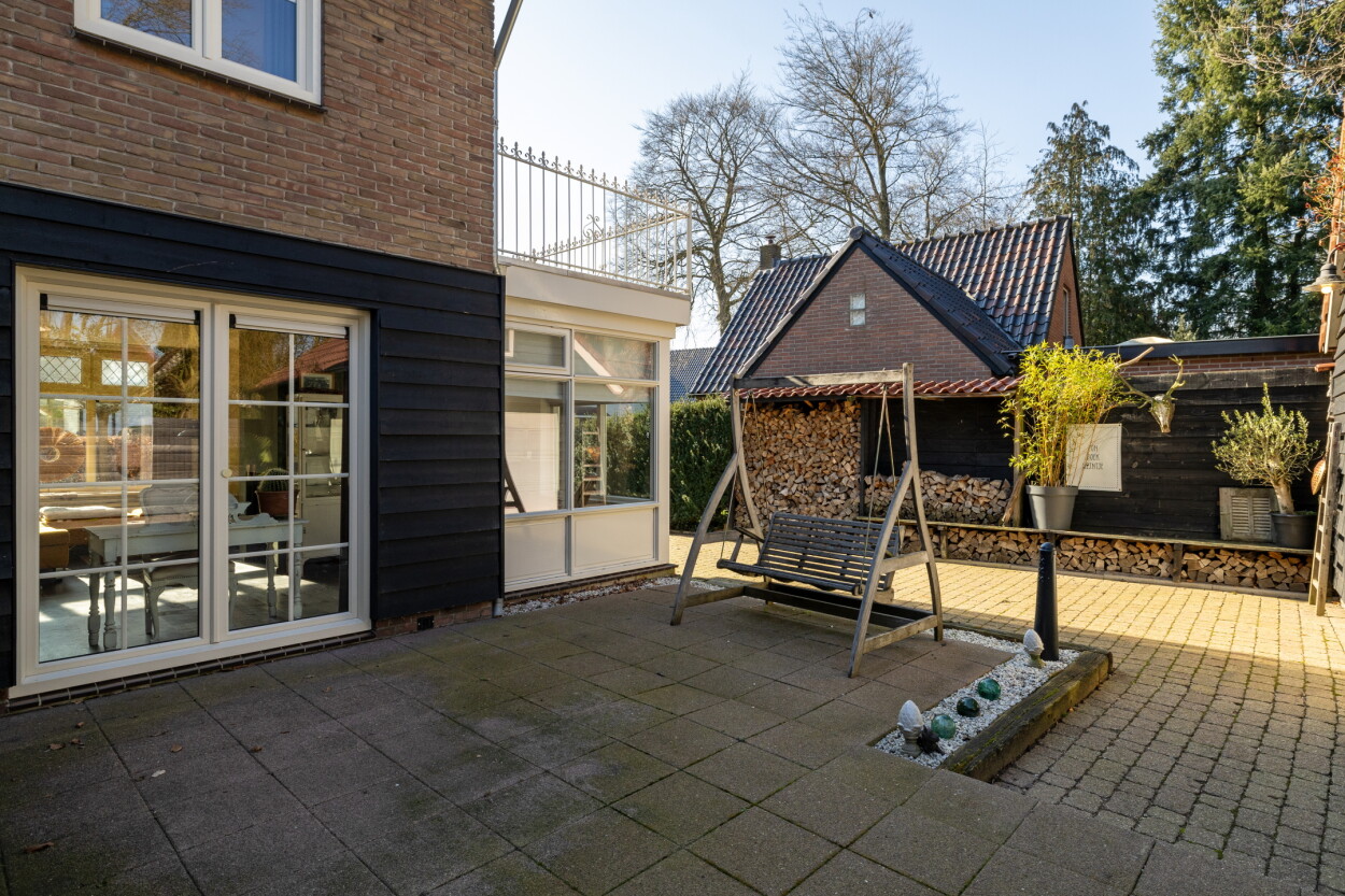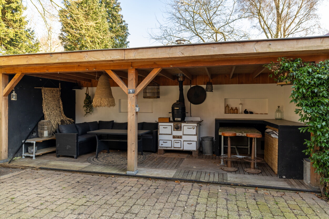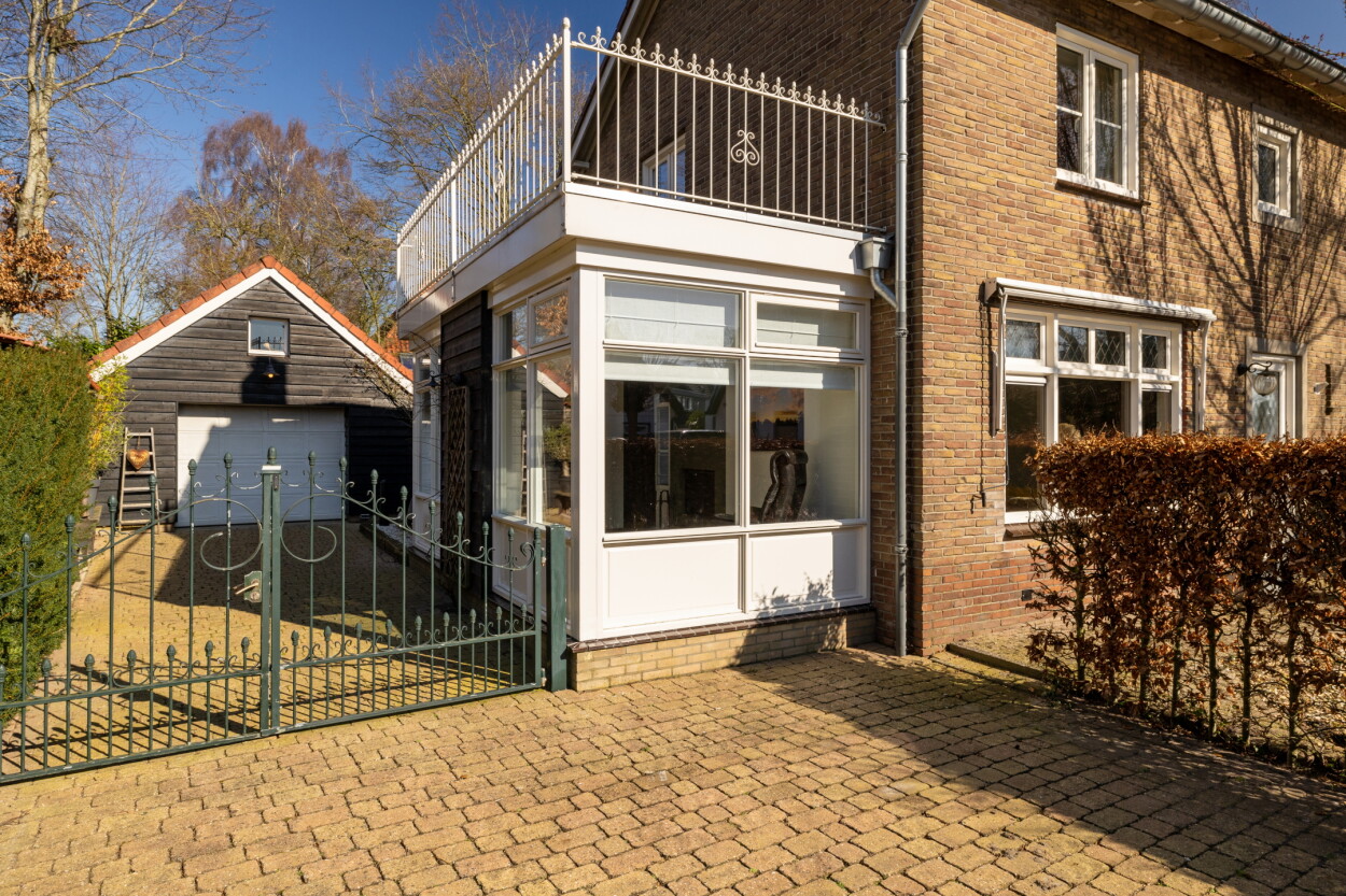 De woning beschikt over een keurig aangelegde voortuin. Aan de zijkant bevindt zich een zeer royale oprit met een toegangshek, die parkeergelegenheid biedt voor meerdere auto's. De onderhoudsvriendelijke achtertuin is gesitueerd op het noordoosten en biedt opvallend veel privacy. U vindt hier een ruim terras en een fantastische veranda. Deze sfeervolle overkapping is uitgerust met een oven/fornuis. In het dak van de veranda zitten nog twee aansluitingen voor evt. een houtkachel.