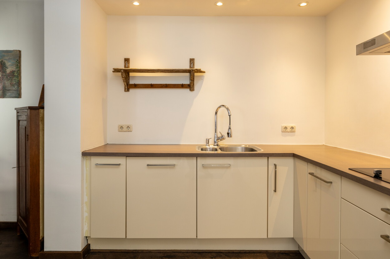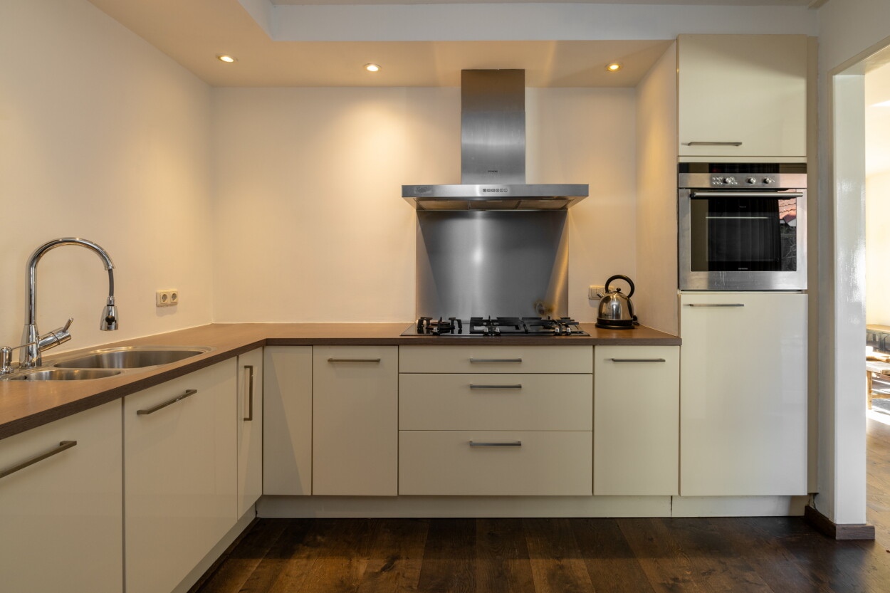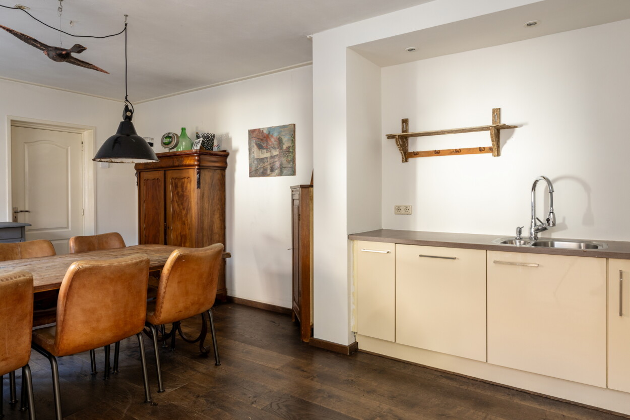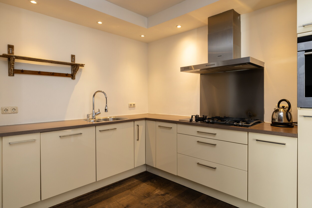 Entree/hal met de trapopgang en een keurig toilet met fontein. Aan de voorzijde bevindt zich de royale woonkamer. Dankzij de prachtige zijuitbouw/serre geniet u hier van een riante leefruimte met veel lichtinval. De strak gestuukte wanden en plafonds vormen samen met de sfeervolle doorkijkhaard en de doorlopende, houten vloer een fraai geheel. Aan de achterzijde is de woning eveneens uitgebouwd en daar bevindt zich de half-open keuken in een praktische hoekopstelling. Deze is voorzien van diverse inbouwapparatuur, waaronder een gaskookplaat, oven, koelkast en afzuigkap. Vanuit de keuken heeft u direct toegang tot de praktische bijkeuken met toegang tot de achtertuin en de cv-opstelling.