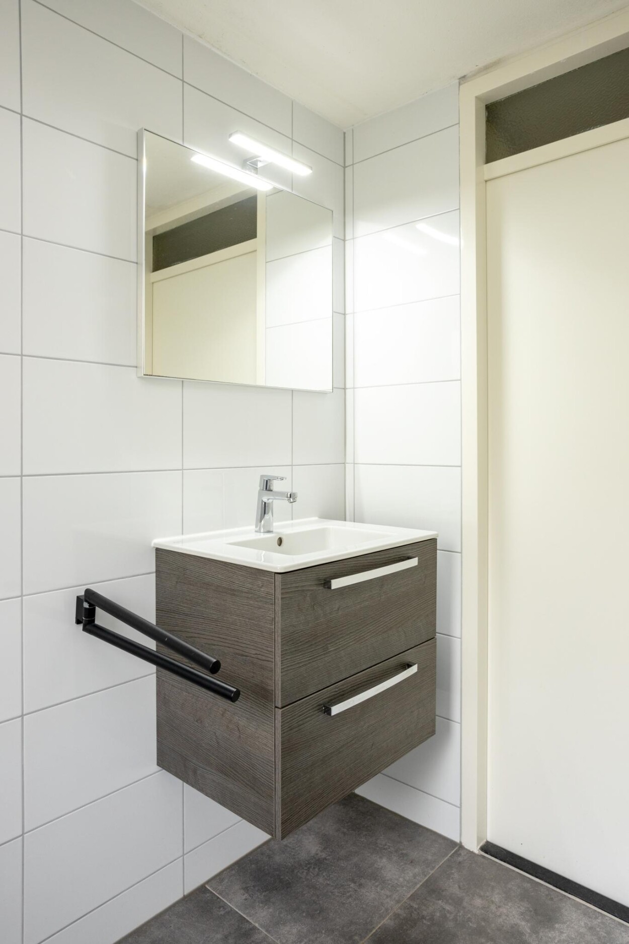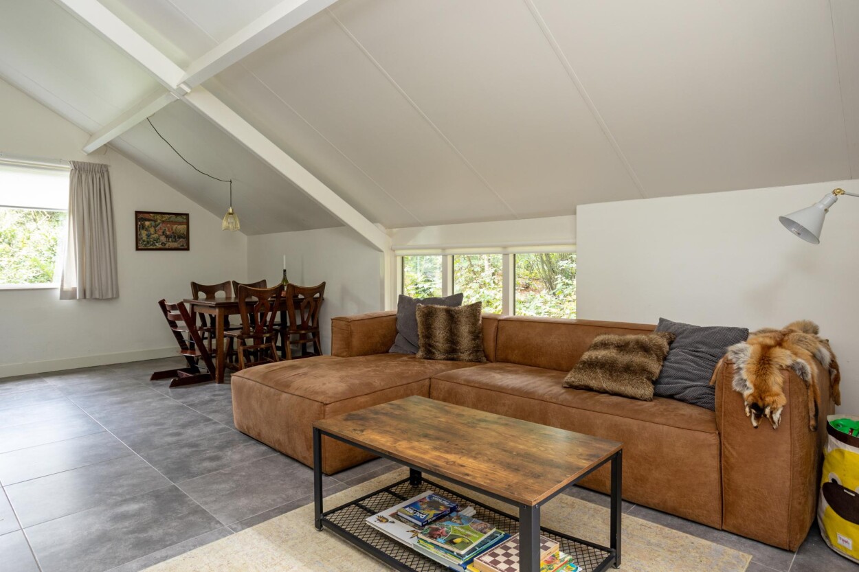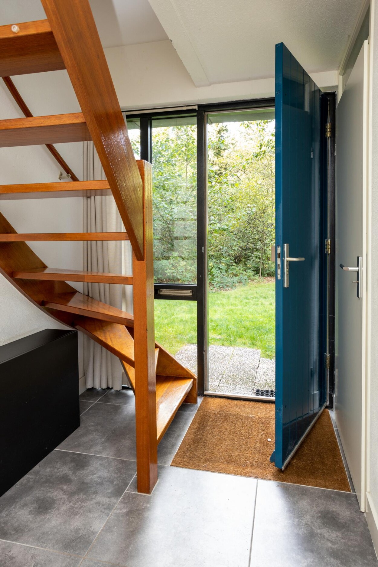 Bij binnenkomst via de entree aan de voorzijde treft u allereerst de hal met vanuit daar toegang tot alle vertrekken. Allereerst gaat u de woonkamer binnen. Dit betreft een fraaie en eigentijdse afgewerkte ruimte met veel lichtinval en vooral een fantastisch uitzicht over de tuin. Doordat de nok in het zicht is geeft dit een extra ruimtelijk effect. Vanuit de woonkamer is er middels een aluminium schuifpui toegang tot het terras. Aangrenzend aan het woongedeelte is de open keuken te vinden. Deze is geplaatst in een rechte opstelling en is voorzien van een koelkast, gaskookplaat en een spoelbak. Vervolgens is er gelijkvloers een ruime slaapkamer te vinden. Tevens is er een badkamer die ook recent is gemoderniseerd en is voorzien van een wastafel met meubel en een inloopdouche. Ook de toiletruimte is recent gemoderniseerd en is separaat te vinden. Tenslotte is er nog een praktische bijkeuken met daar de aansluitingen voor de wasapparatuur, de CV-opstelling en een achter-entree naar de tuin. De begane grond is voorzien van een nette plavuizenvloer met vloerverwarming.