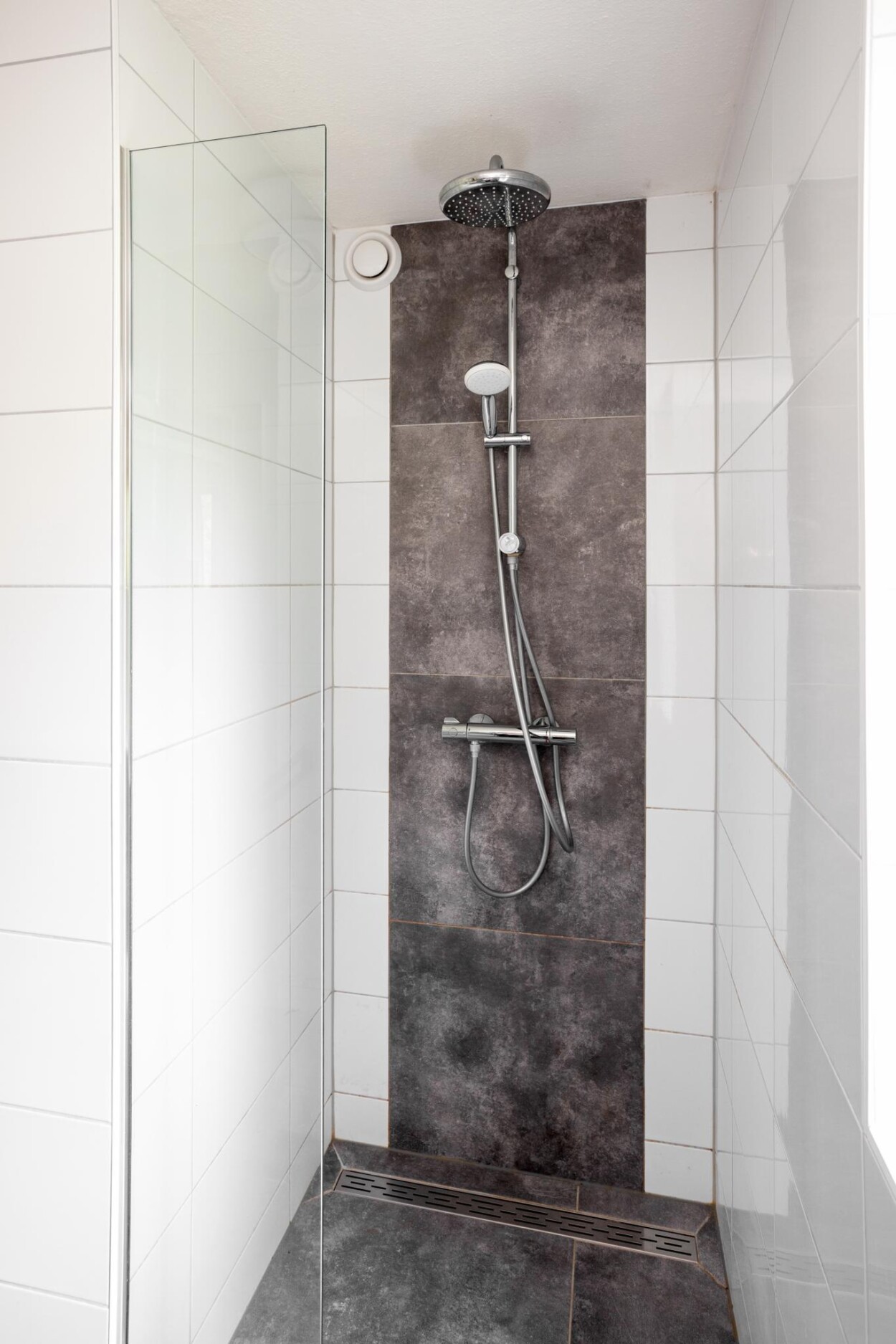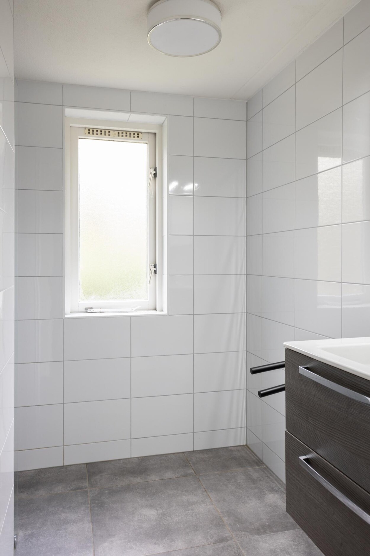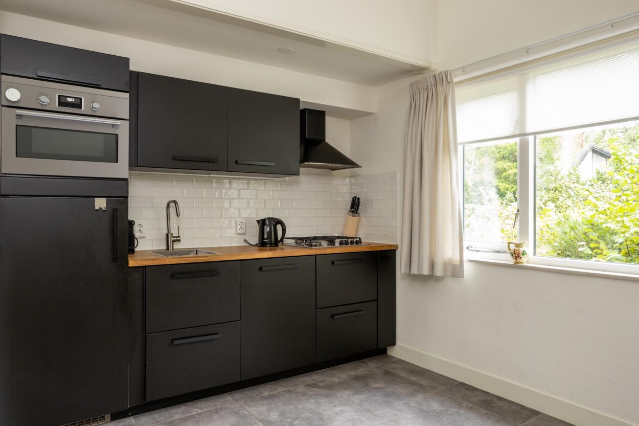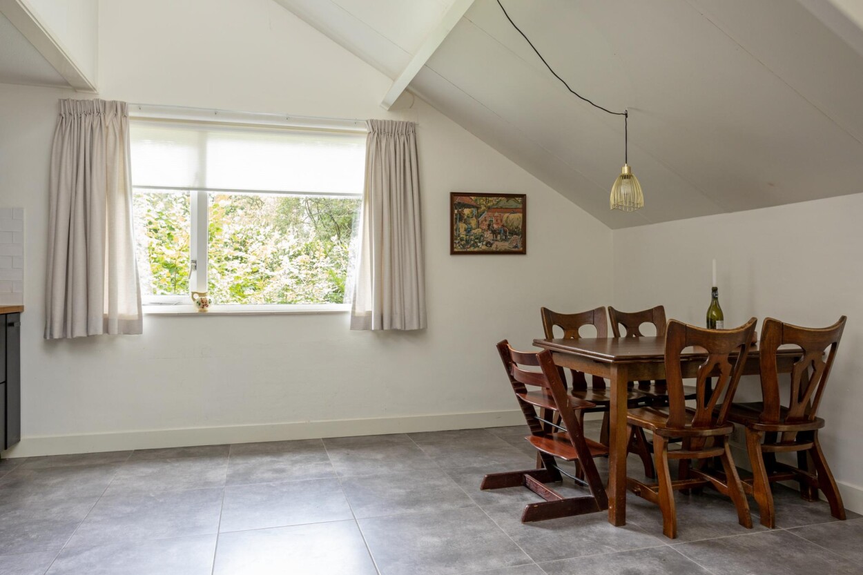 Bij binnenkomst via de entree aan de voorzijde treft u allereerst de hal met vanuit daar toegang tot alle vertrekken. Allereerst gaat u de woonkamer binnen. Dit betreft een fraaie en eigentijdse afgewerkte ruimte met veel lichtinval en vooral een fantastisch uitzicht over de tuin. Doordat de nok in het zicht is geeft dit een extra ruimtelijk effect. Vanuit de woonkamer is er middels een aluminium schuifpui toegang tot het terras. Aangrenzend aan het woongedeelte is de open keuken te vinden. Deze is geplaatst in een rechte opstelling en is voorzien van een koelkast, gaskookplaat en een spoelbak. Vervolgens is er gelijkvloers een ruime slaapkamer te vinden. Tevens is er een badkamer die ook recent is gemoderniseerd en is voorzien van een wastafel met meubel en een inloopdouche. Ook de toiletruimte is recent gemoderniseerd en is separaat te vinden. Tenslotte is er nog een praktische bijkeuken met daar de aansluitingen voor de wasapparatuur, de CV-opstelling en een achter-entree naar de tuin. De begane grond is voorzien van een nette plavuizenvloer met vloerverwarming.