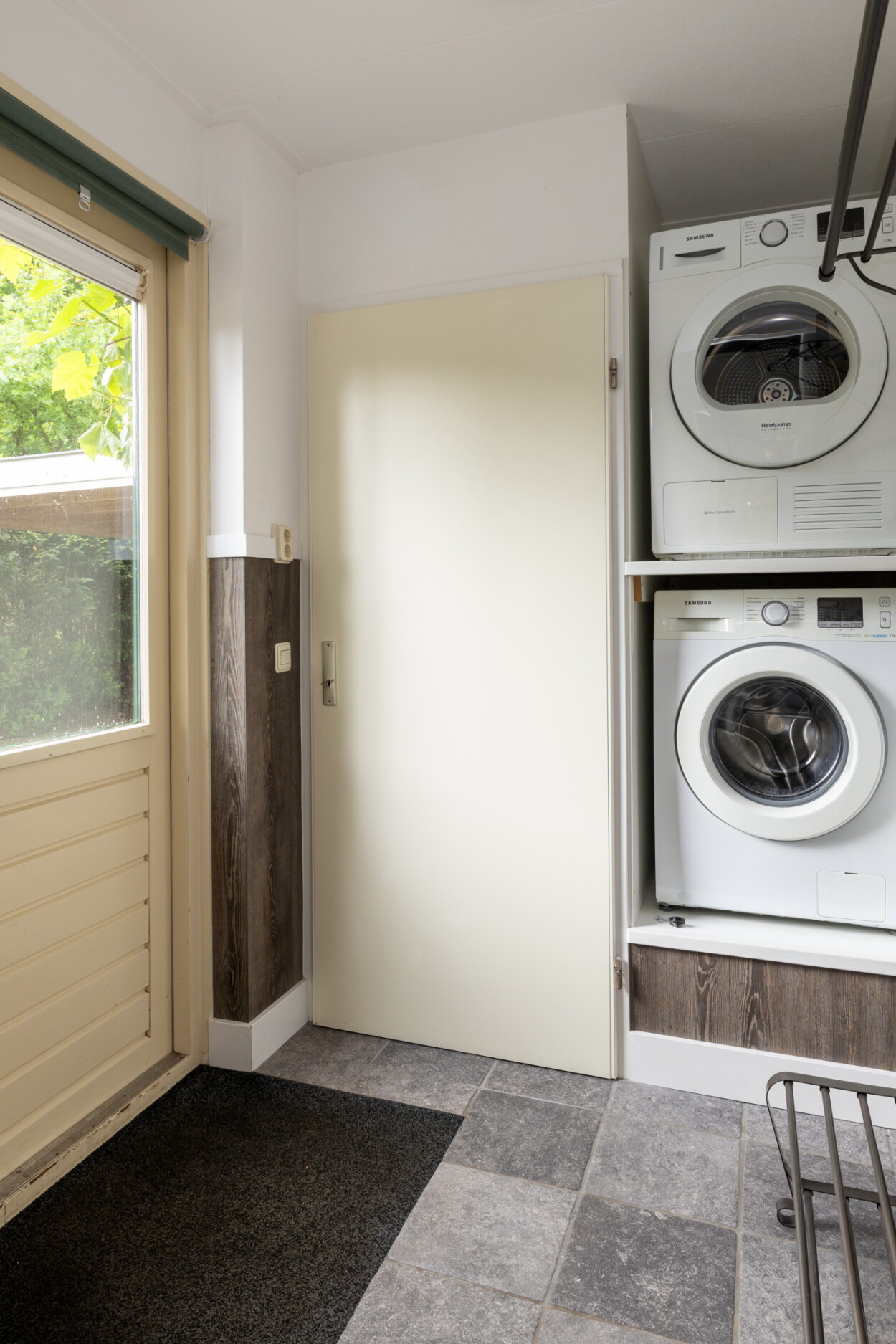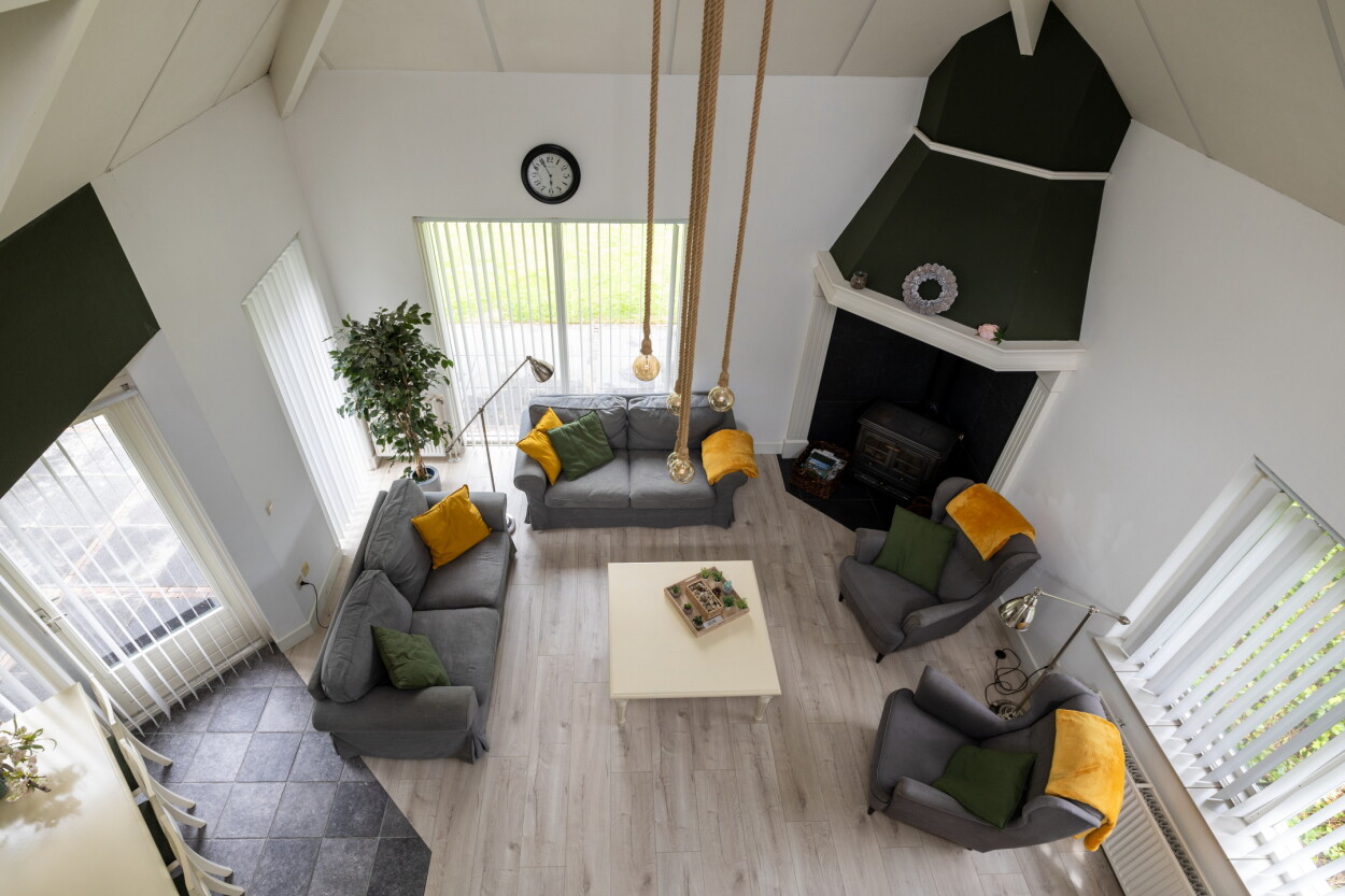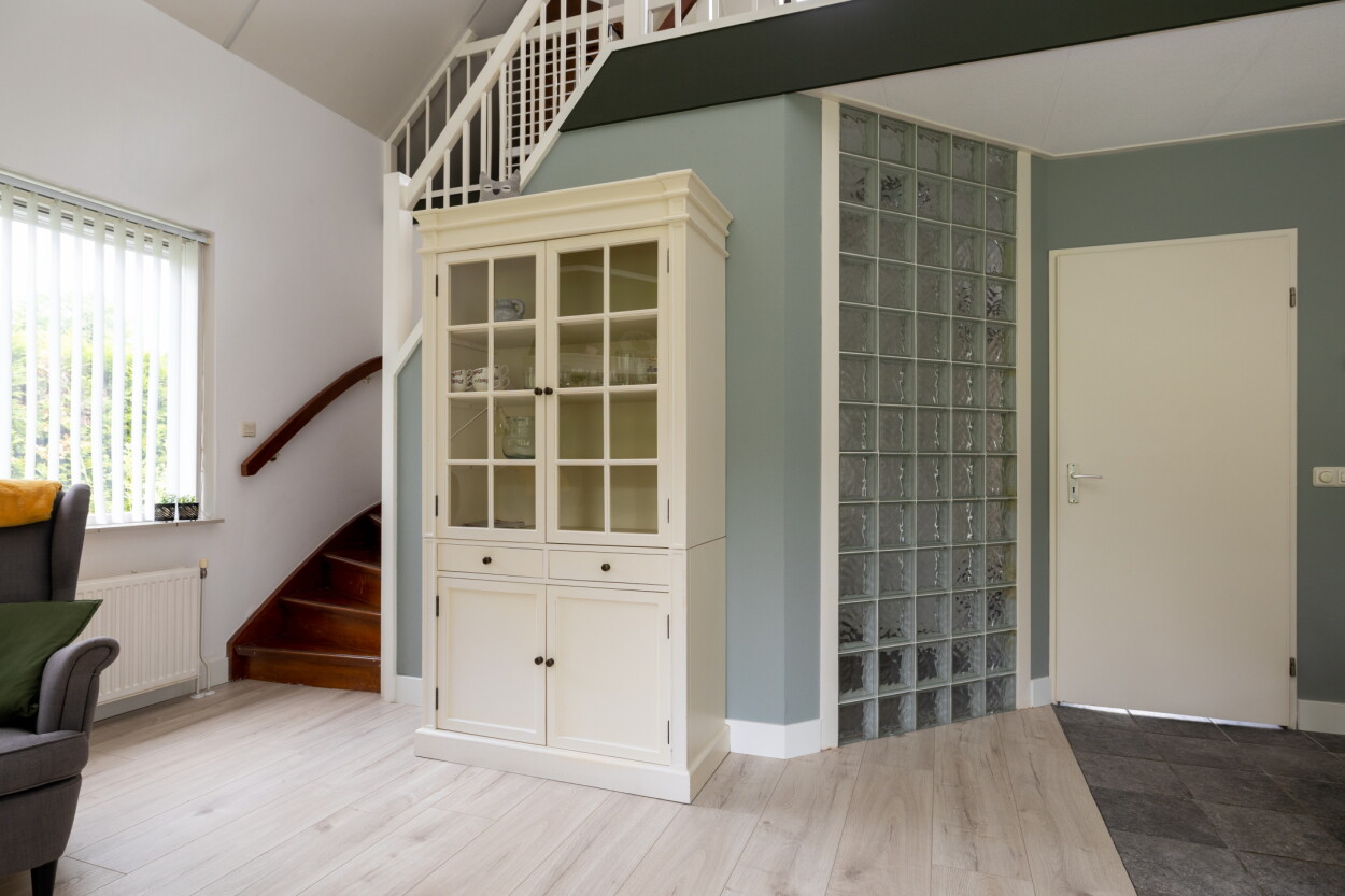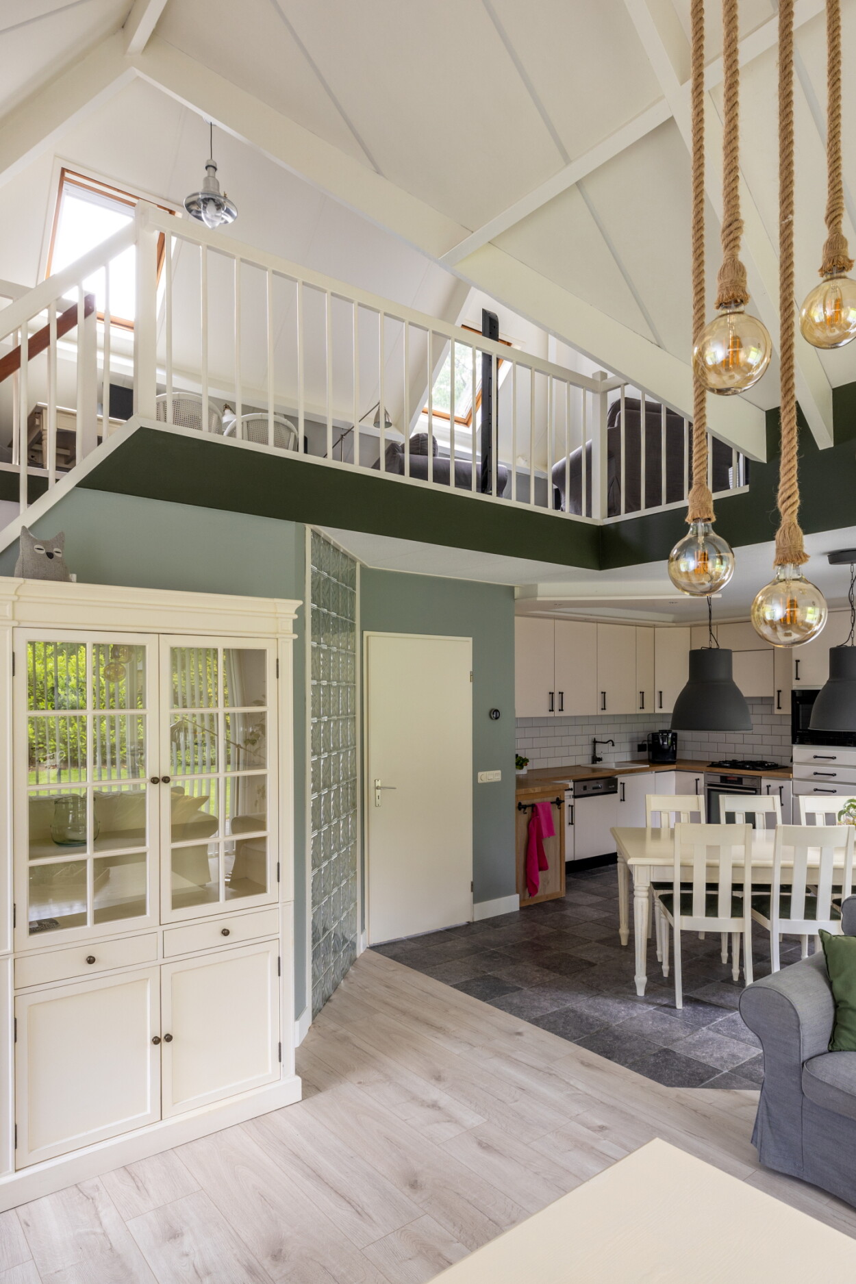 Entree, ruime hal met meterkast en toilet. Bijkeuken met aansluitingen voor cv en wasmachine. Nette badkamer met een vaste wastafel, ligbad en een douche. Vervolgens is er de ruime en lichte woonkamer, voorzien van een laminaatvloer. Door het vele glas is het hier optimaal genieten van de Veluwe. Er is een houtkachel aanwezig en tevens zijn er openslaande deuren naar het terras. Doordat de nok in het zicht gelaten is, heeft het een ruimtelijke beleving, met een vide naar de verdieping. De open keuken is voorzien van een nette hoekopstelling, met een koelkast, vaatwasser, gas kookplaat en afzuigkap, oven en een combi-magnetron.