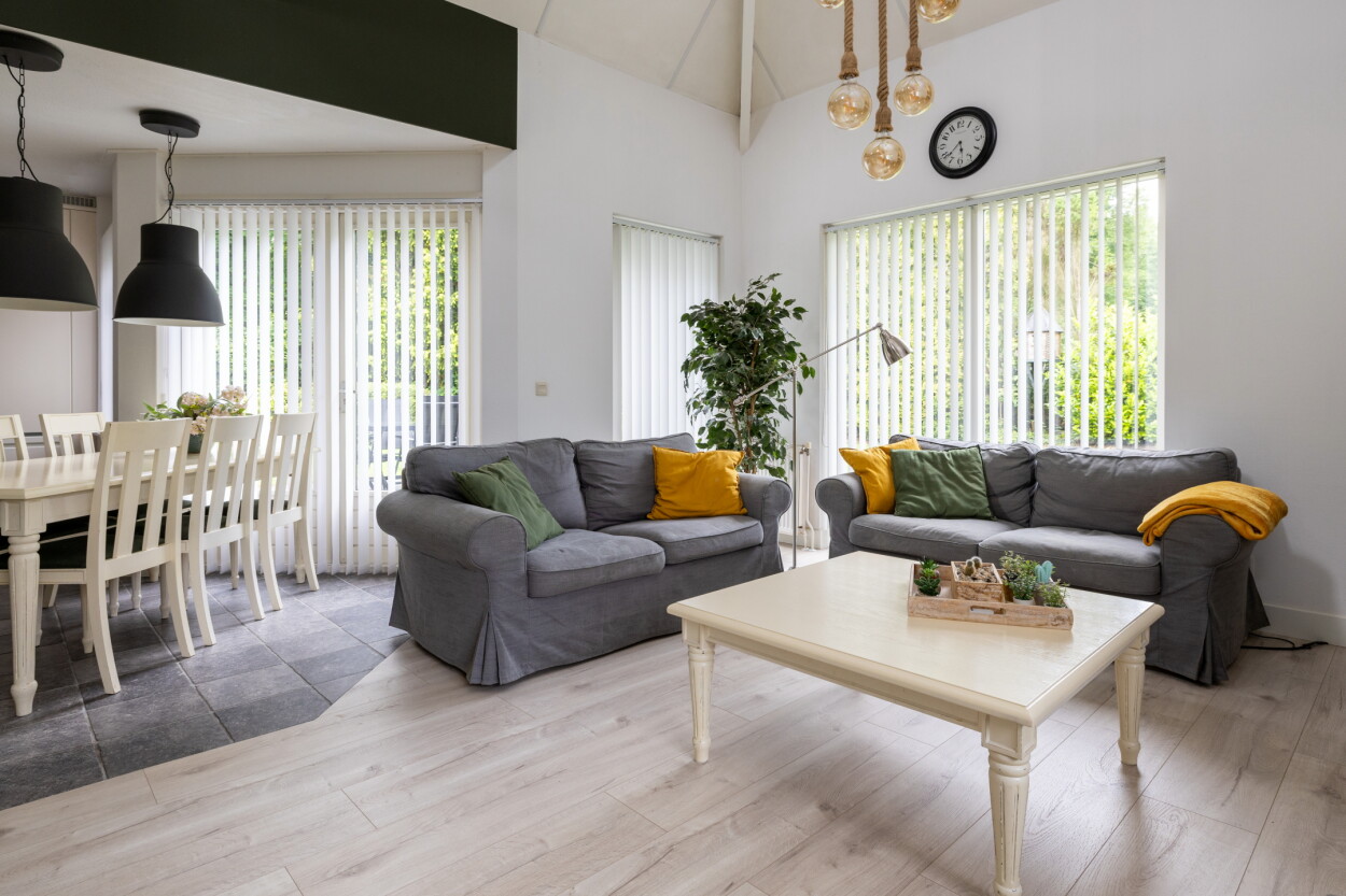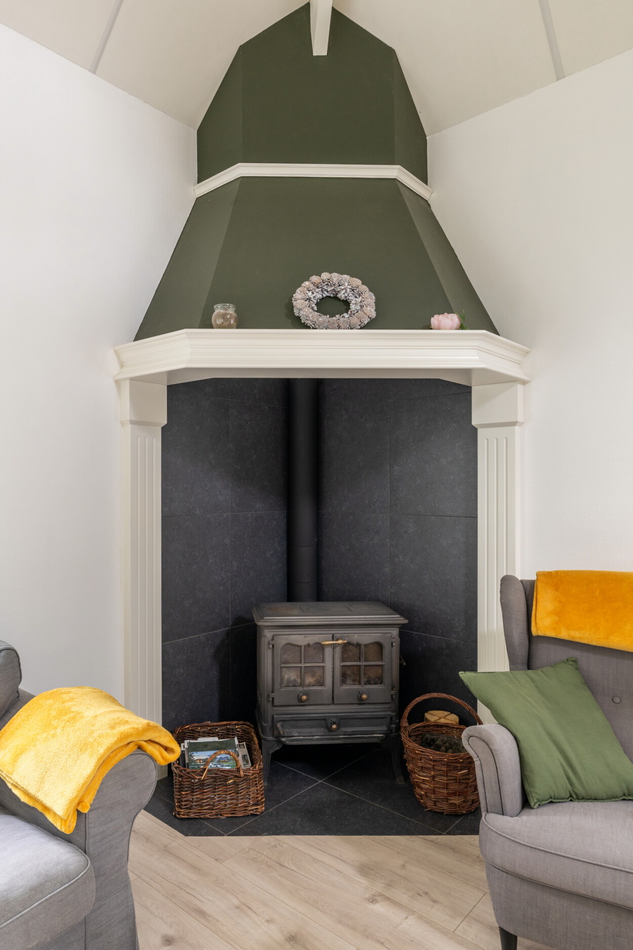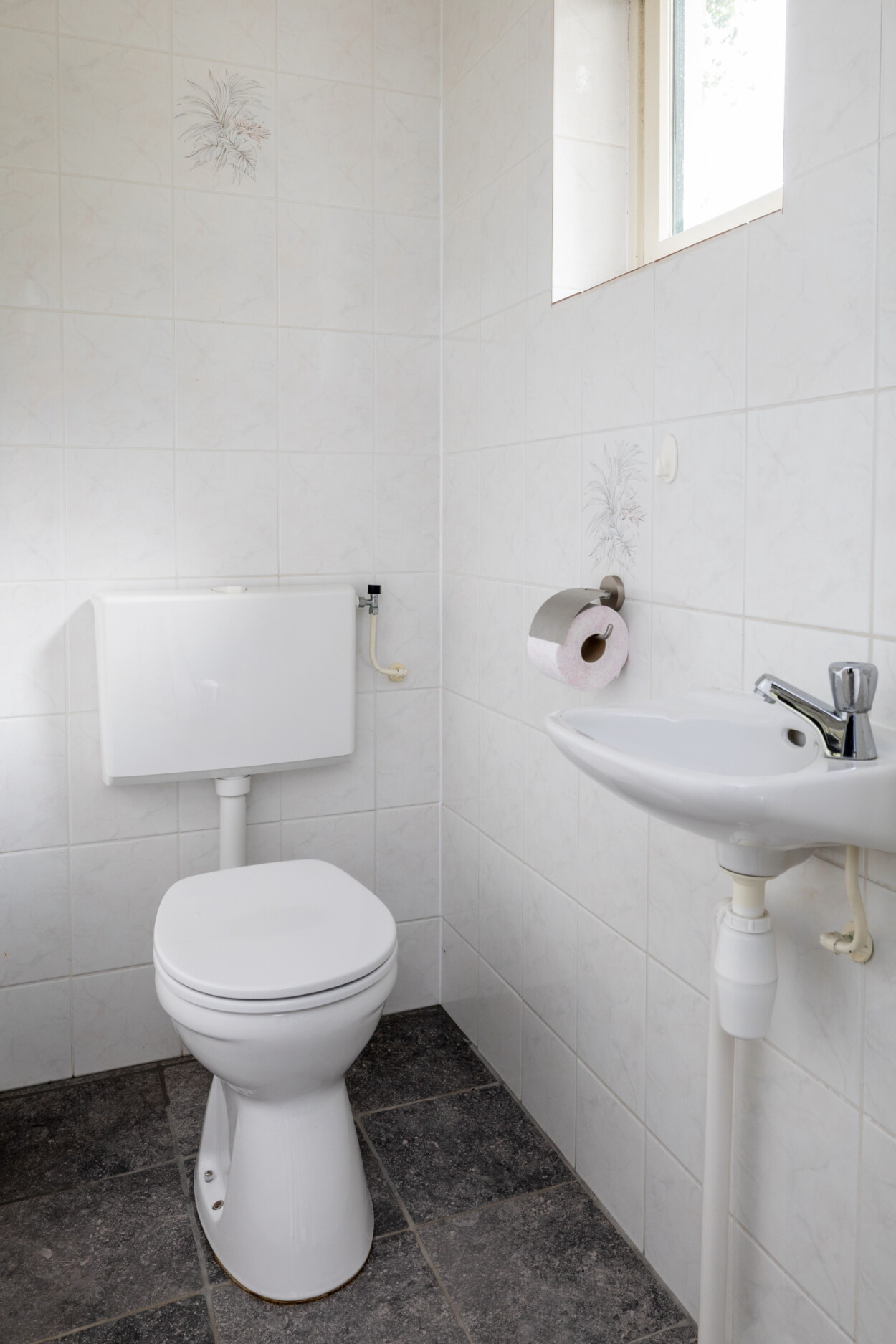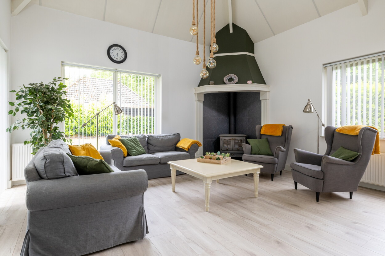 Entree, ruime hal met meterkast en toilet. Bijkeuken met aansluitingen voor cv en wasmachine. Nette badkamer met een vaste wastafel, ligbad en een douche. Vervolgens is er de ruime en lichte woonkamer, voorzien van een laminaatvloer. Door het vele glas is het hier optimaal genieten van de Veluwe. Er is een houtkachel aanwezig en tevens zijn er openslaande deuren naar het terras. Doordat de nok in het zicht gelaten is, heeft het een ruimtelijke beleving, met een vide naar de verdieping. De open keuken is voorzien van een nette hoekopstelling, met een koelkast, vaatwasser, gas kookplaat en afzuigkap, oven en een combi-magnetron.