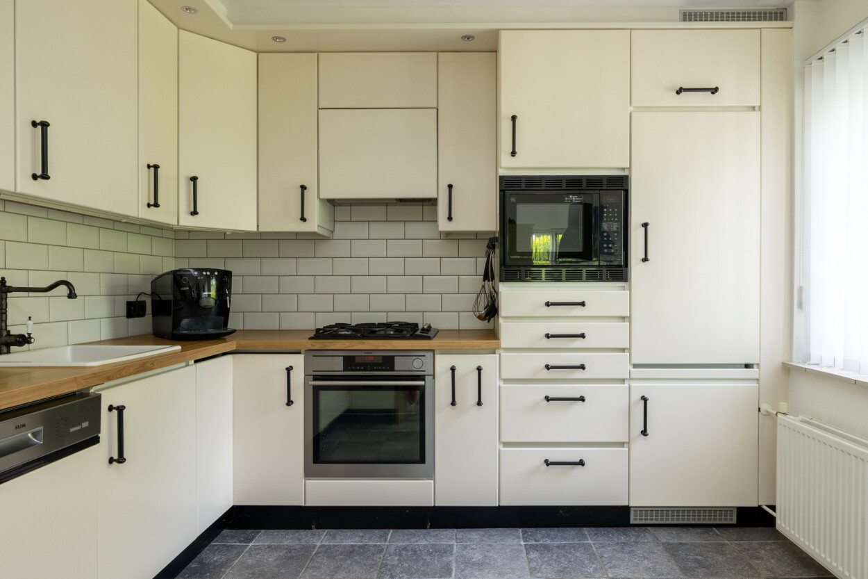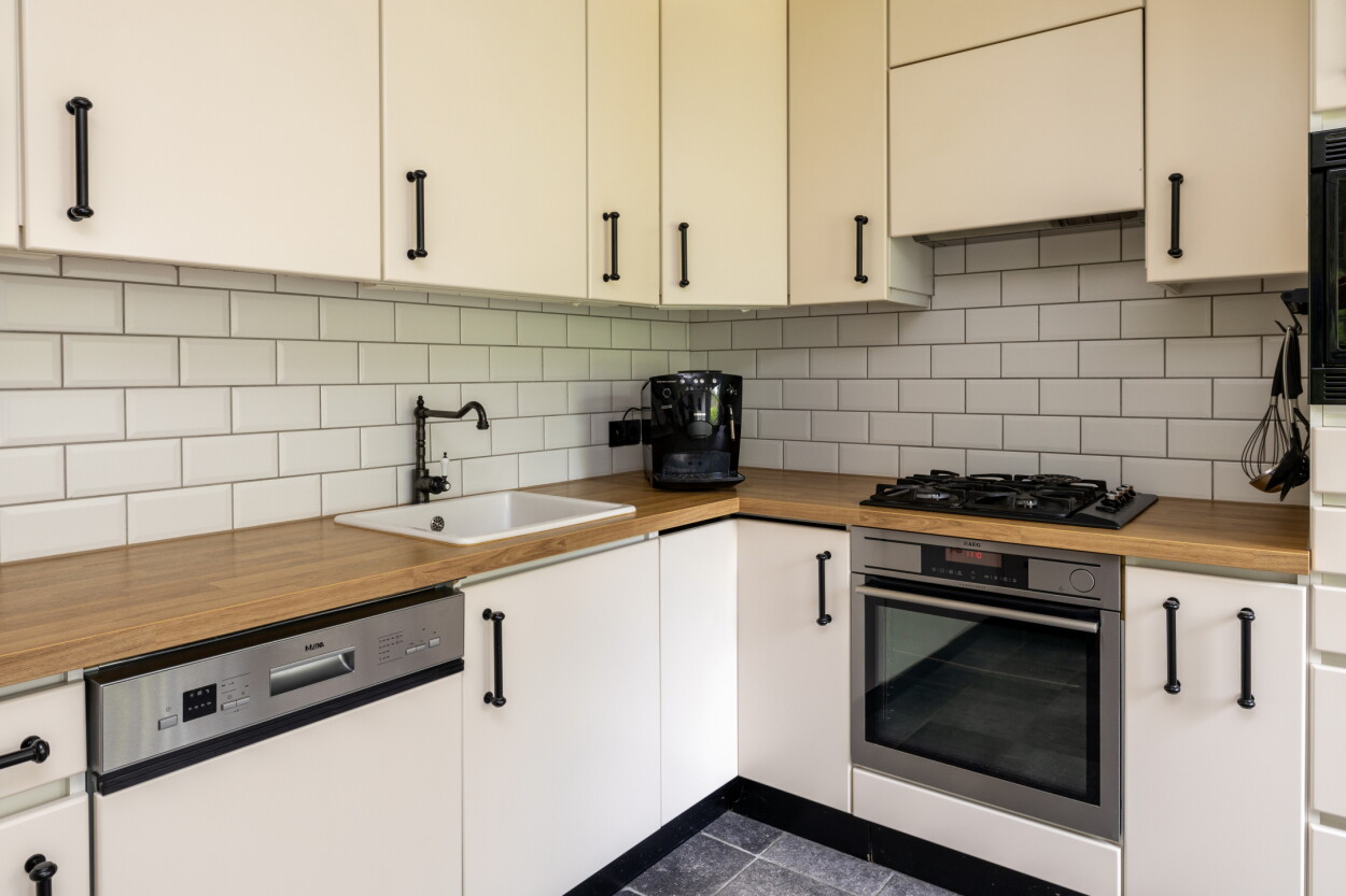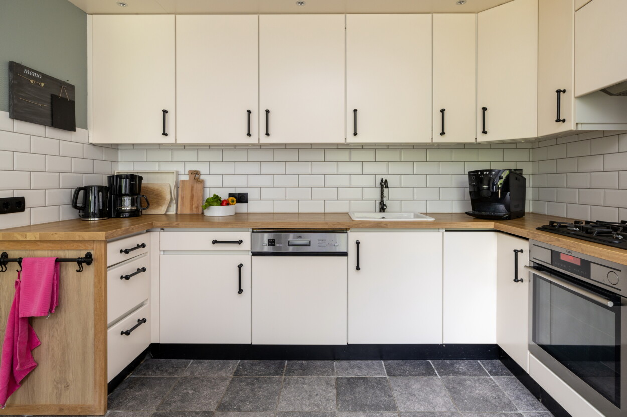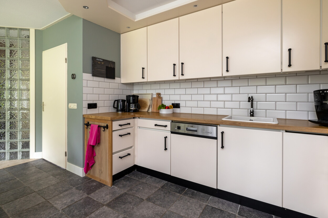 Entree, ruime hal met meterkast en toilet. Bijkeuken met aansluitingen voor cv en wasmachine. Nette badkamer met een vaste wastafel, ligbad en een douche. Vervolgens is er de ruime en lichte woonkamer, voorzien van een laminaatvloer. Door het vele glas is het hier optimaal genieten van de Veluwe. Er is een houtkachel aanwezig en tevens zijn er openslaande deuren naar het terras. Doordat de nok in het zicht gelaten is, heeft het een ruimtelijke beleving, met een vide naar de verdieping. De open keuken is voorzien van een nette hoekopstelling, met een koelkast, vaatwasser, gas kookplaat en afzuigkap, oven en een combi-magnetron.