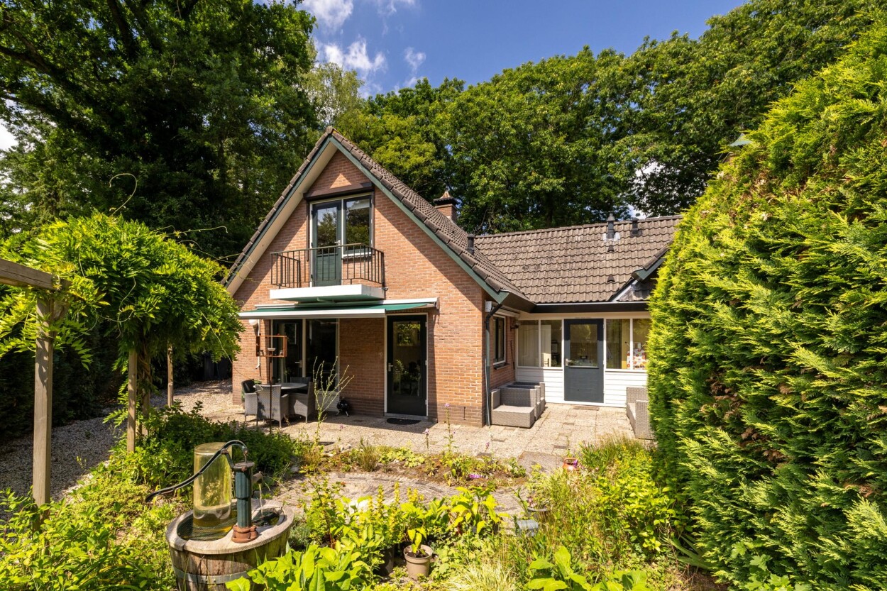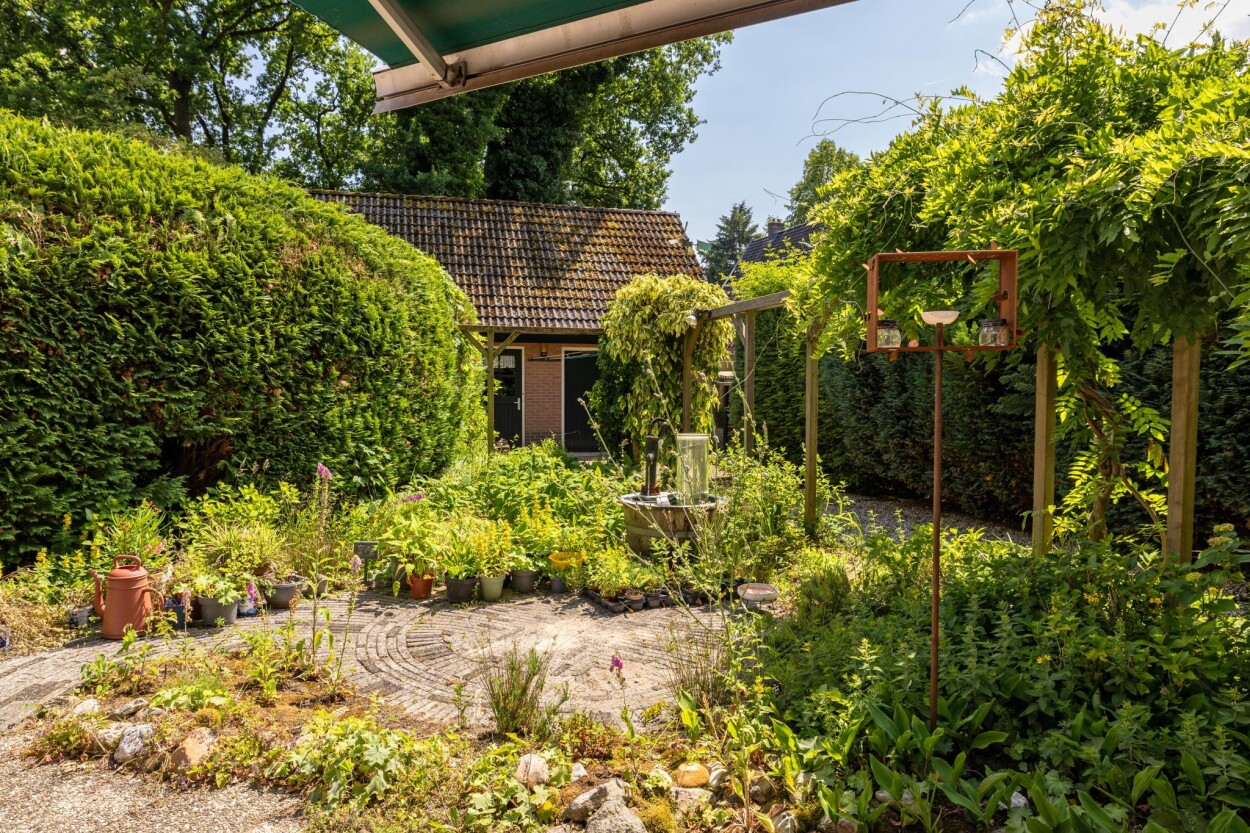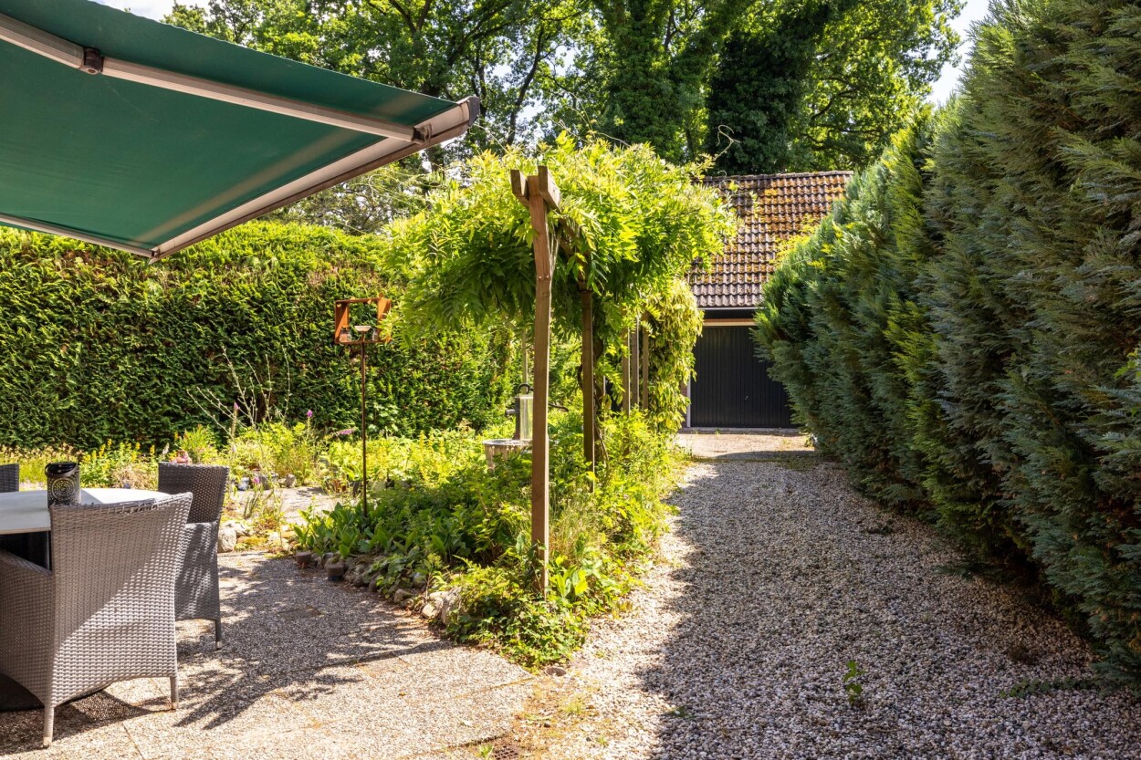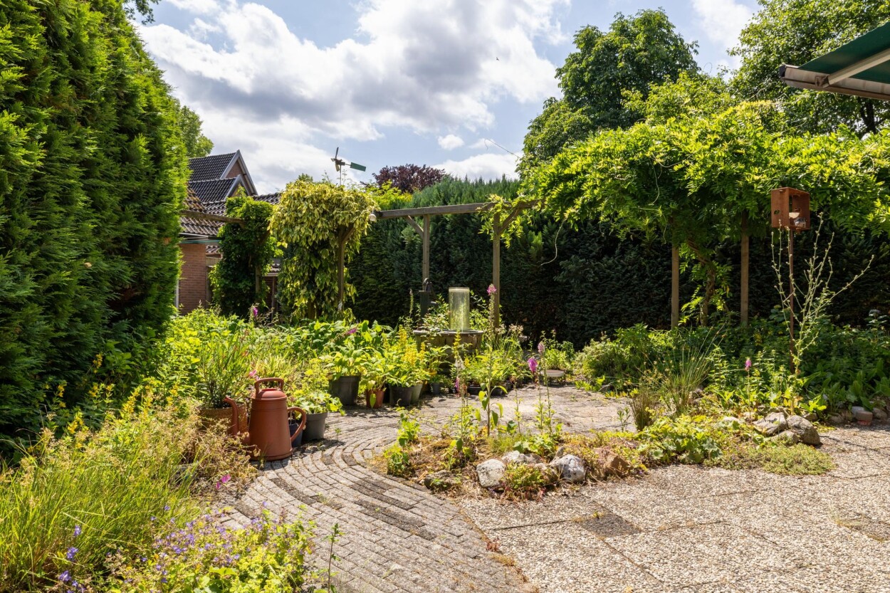 Voor de woning ligt een diepe bostuin met een oprit voor meerdere auto’s. Achter de woning ligt een besloten achtertuin met terras met veel privacy en kleine vijverpartij.