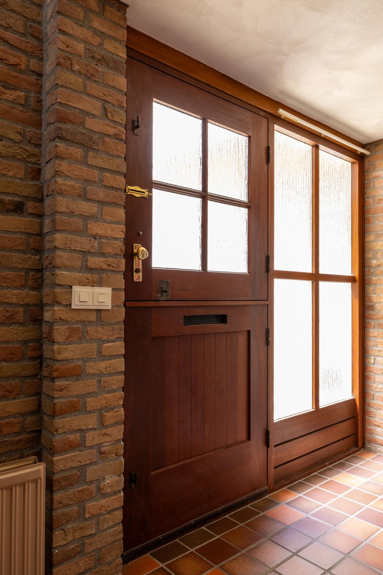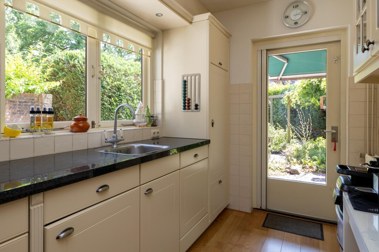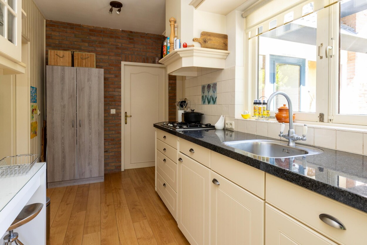 Entree, ruime ontvangsthal met meterkast en toilet (met tevens vanuit de toilet een doorgang naar de badkamer). Aan de voorzijde is er allereerst een ruime slaapkamer/kantoor, met toegang naar de badkamer. Dit betreft nog de originele badkamer en is voorzien van een ligbad, douchegedeelte en wastafel en doorgang naar de separate toilet. Vervolgens is er de sfeervolle woonkamer met een open haard en tevens een deur naar de achtertuin. Vanuit de woonkamer en vanuit de hal is de toegang naar de keuken. Een nette keukenopstelling met koelkast, vaatwasser, vier pits gas kookplaat en een deur naar de achtertuin. Bovendien is er een praktische bijkeuken met ingebouwde kasten en aansluitingen voor de wasapparatuur en een deur naar het terras. Vanuit de bijkeuken is er een vlizotrap naar een bergzolder boven dit gedeelte van de woning met deels stahoogte en opstelling voor de cv-ketel.