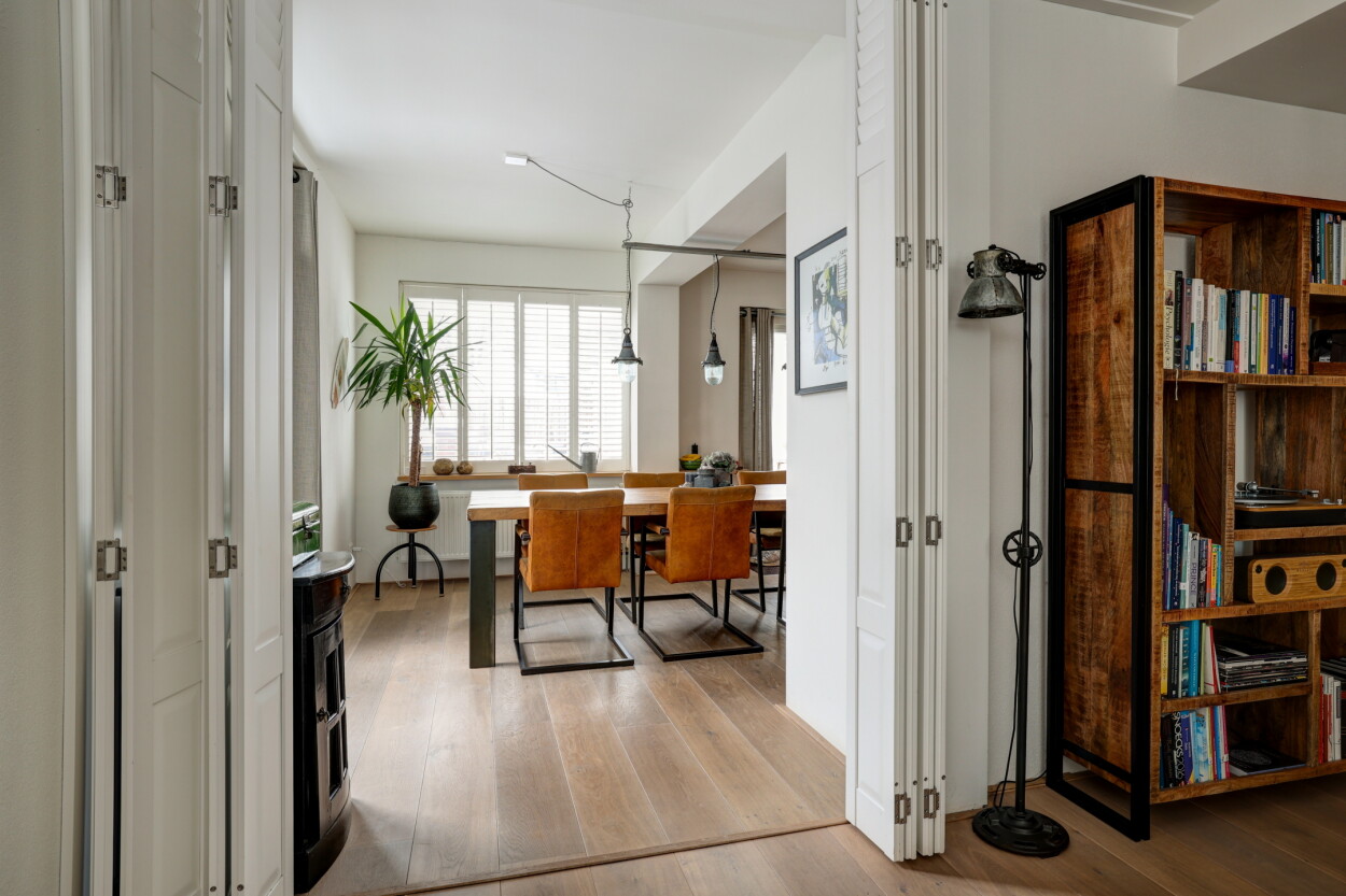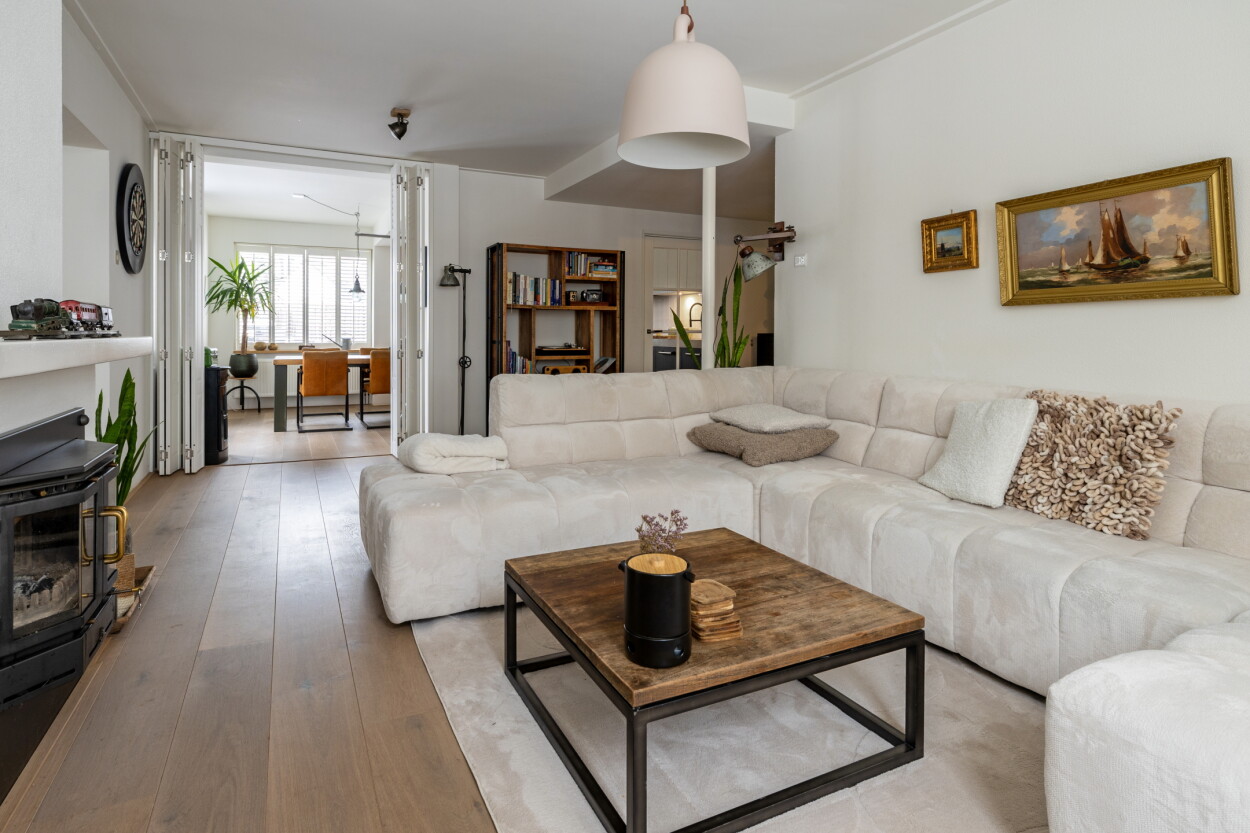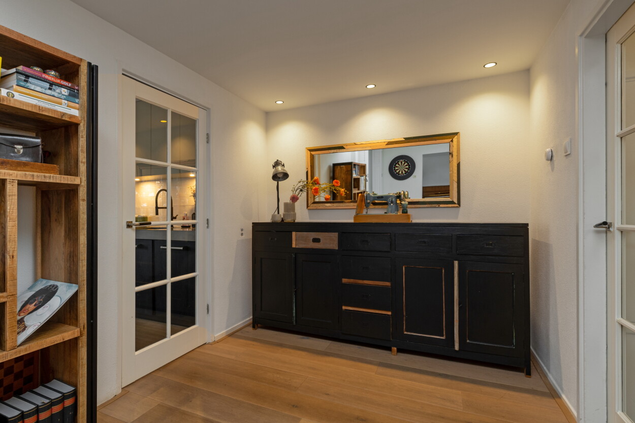 Entree, hal met toilet, trappartij en een kelderkast met vernieuwde meterkast. De speels ingedeelde woonkamer is een sfeervolle ruimte en ingedeeld als een gezellige zitkamer aan de voorzijde rondom de houtkachel. Doordat de voormalige garage naast de woning bij de woonkamer is getrokken, is er een leuke hoek in de woonkamer ontstaan wat een ideale werkplek is of een heerlijke lounge-/speelkamer. De aanbouw aan de achterzijde is ook een grote meerwaarde. Dat is een fantastische woonkeuken geworden, waar een grote eethoek in kwijt kan en openslaande deuren zorgen voor ‘contact’ met de diepe achtertuin. Daar is overigens eerst een praktische veranda die geheel af te sluiten is aan de boven-/achter-/zijkant met screens. De woonkeuken is voorzien van een luxe keukenopstelling die in 2024 nog vernieuwd is en voorzien is van een grote koelkast, vriezer, vaatwasser, inductie kookplaat en een oven. Vanuit de keuken is via de veranda de aangebouwde bijkeuken bereikbaar, met daar de aansluitingen voor wasapparatuur.