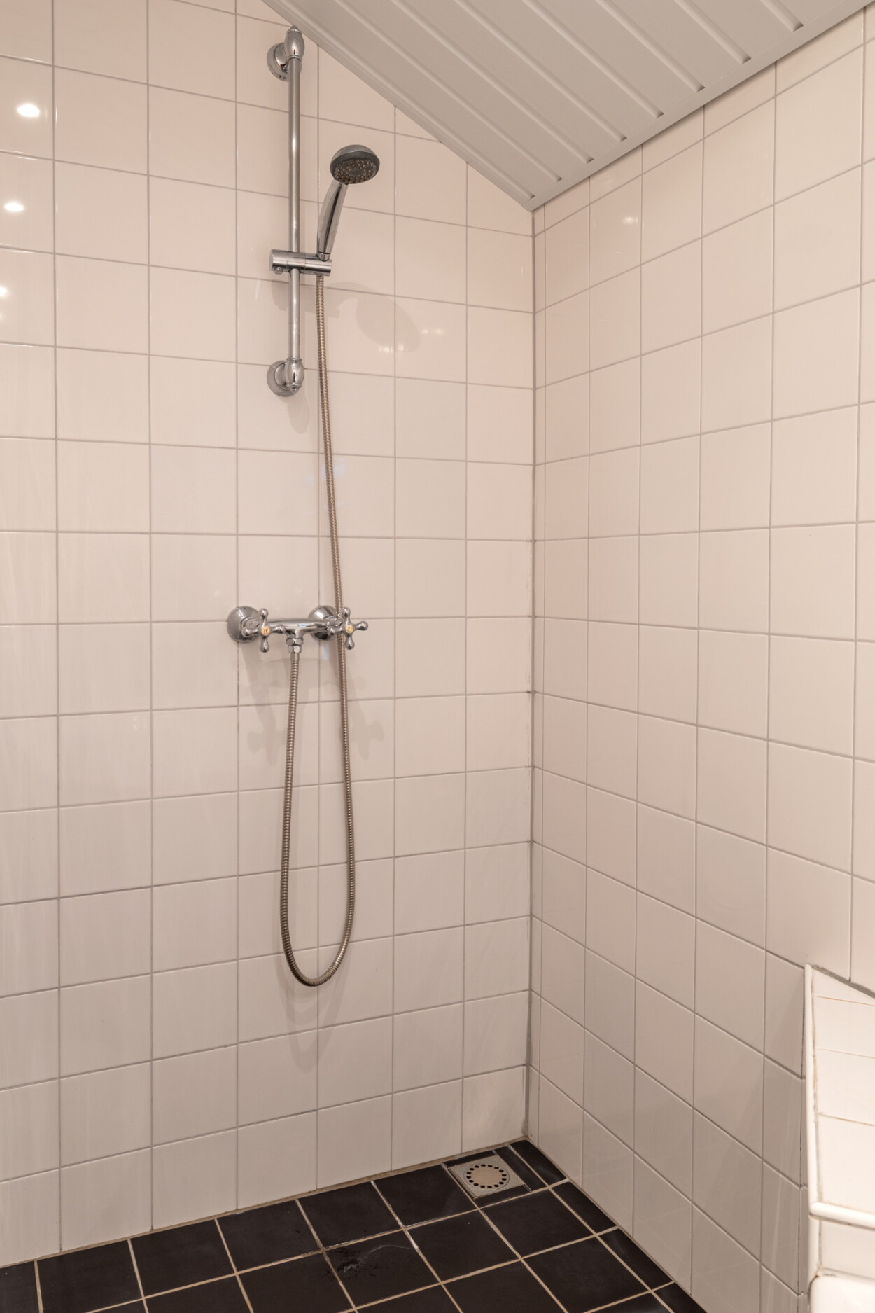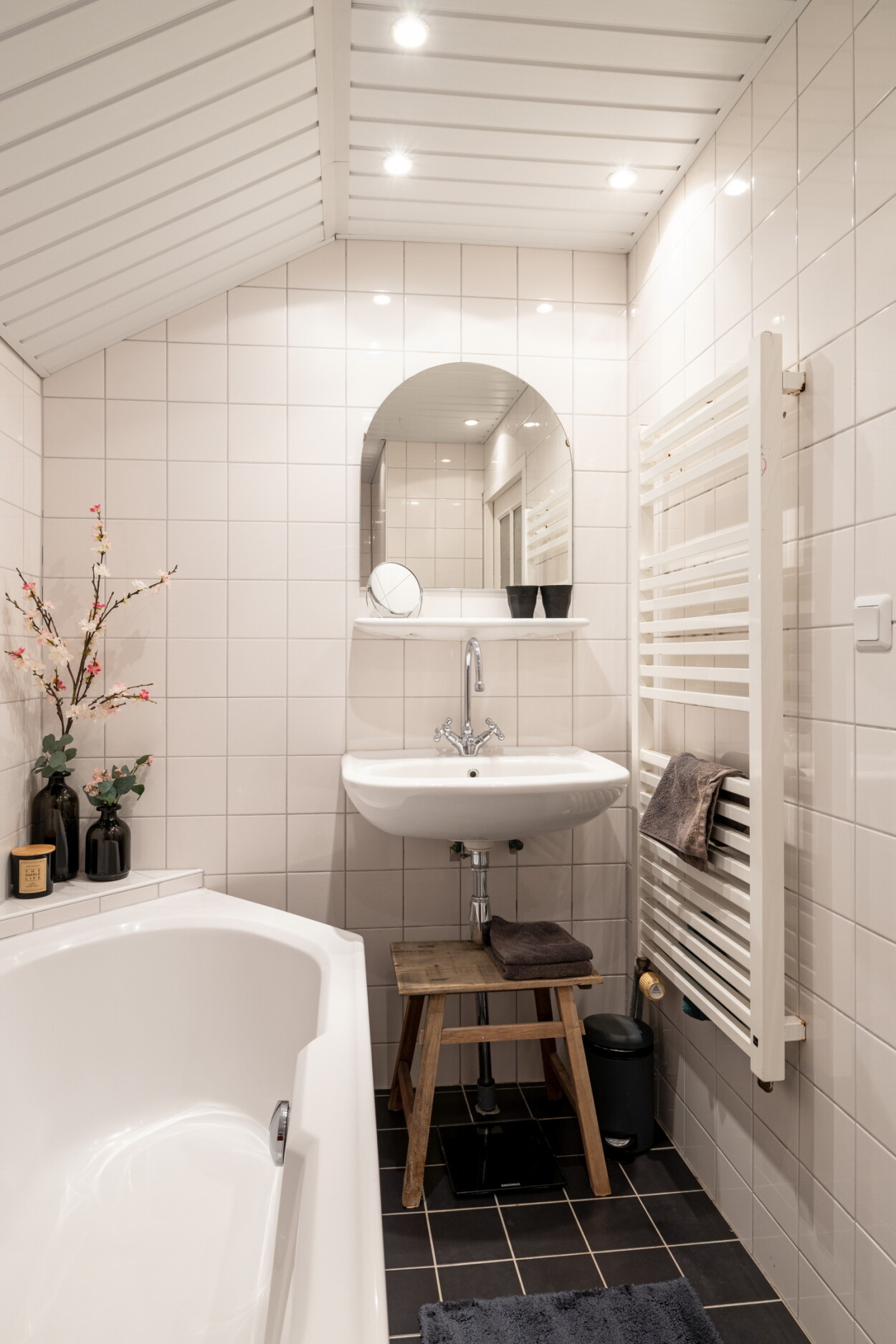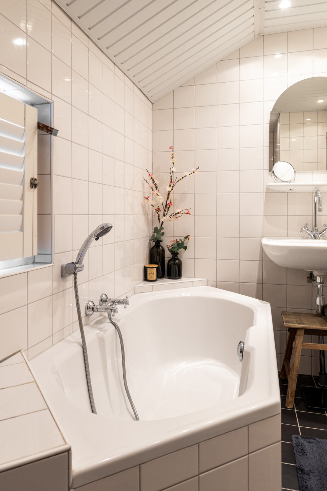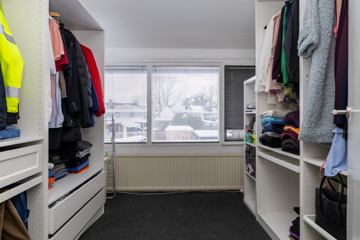 Overloop met ingebouwde kast met cv-opstelling. Totaal zijn er hier drie slaapkamers. De uitgebouwde badkamer biedt een nette en neutrale afwerking met een ligbad, douchegedeelte en een wastafel. Twee slaapkamers zijn voorzien van ingebouwde kasten en rolluiken.