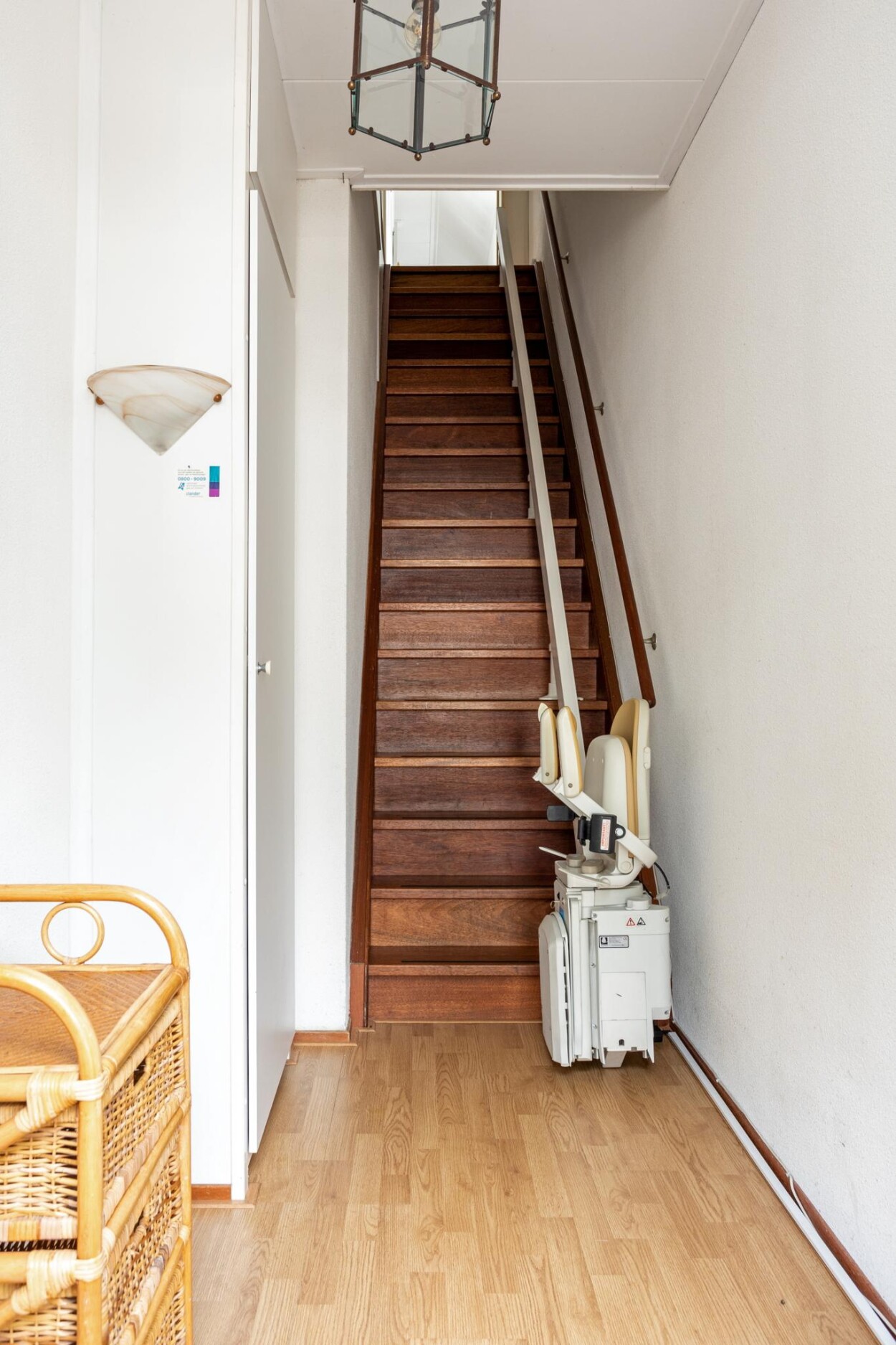 Vanaf de Stationslaan is er middels een eigen entree toegang tot het appartement. U komt daar allereerst in de hal op de begane grond met daar de meterkast en de trappartij met traplift naar de verdieping. Vervolgens is er vanuit de gang toegang tot alle woonvertrekken. Allereerst de woonkamer. De woonkamer is over de gehele breedte aan de voorzijde gelegen, waardoor er diverse mogelijkheden zijn voor een zithoek. Vanuit hier is er een fraai uitzicht over de voorgelegen Stationslaan via de diverse raampartijen. Aangrenzend treft u de open keuken. Deze is geplaatst in een hoekopstelling en is voorzien van inbouwapparatuur, waaronder een vaatwasser, 4-pits gaskookplaat, koelkast en een oven. Aangrenzend treft u een praktische bijkeuken met daar tevens de CV-installatie. Vervolgens is er vanuit de gang toegang tot een tweetal slaapkamers. Deze zijn beide aan de achterzijde gelegen en zijn ruim van formaat. Één van de slaapkamers heeft toegang tot het dakterras. Tenslotte is er nog een separate toiletruimte en een badkamer. De badkamer is voorzien van een douchecabine, vaste wastafel met meubel en een eigen toilet.