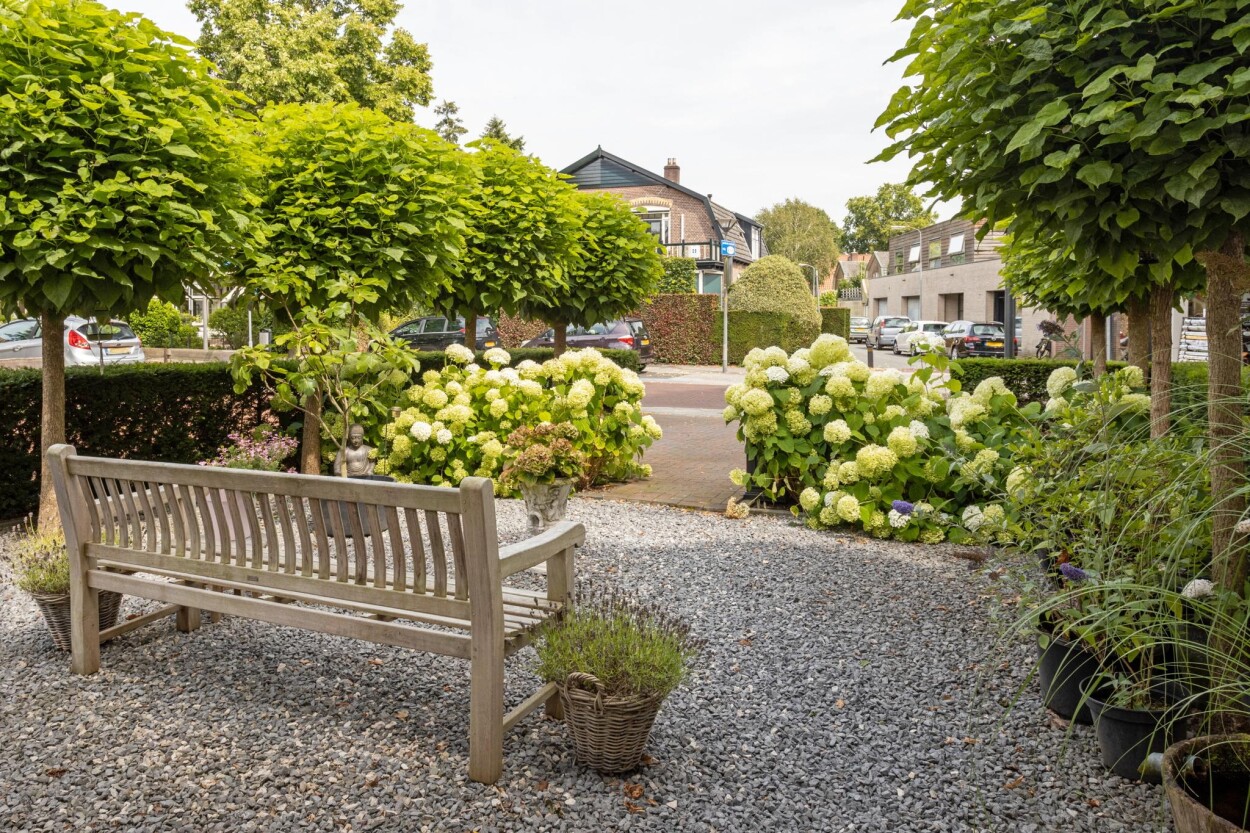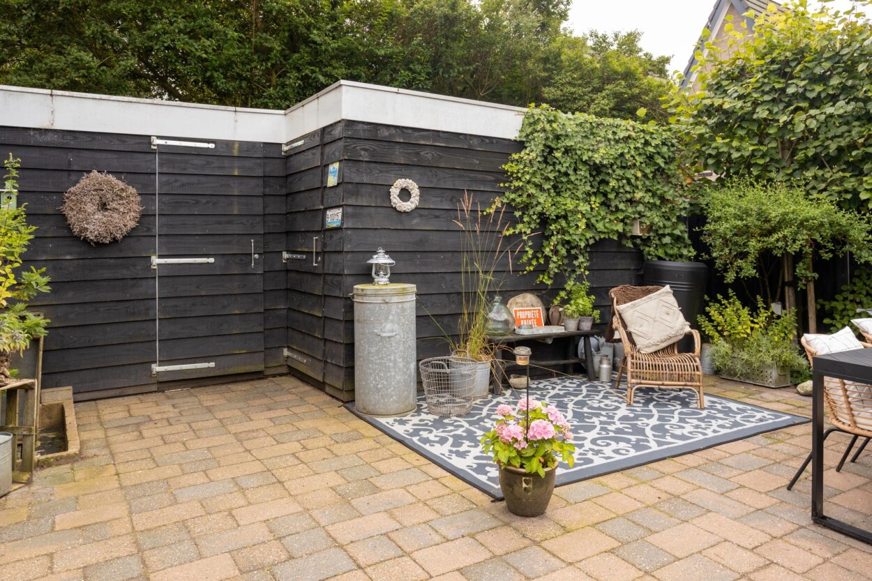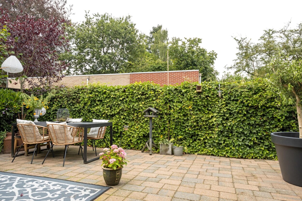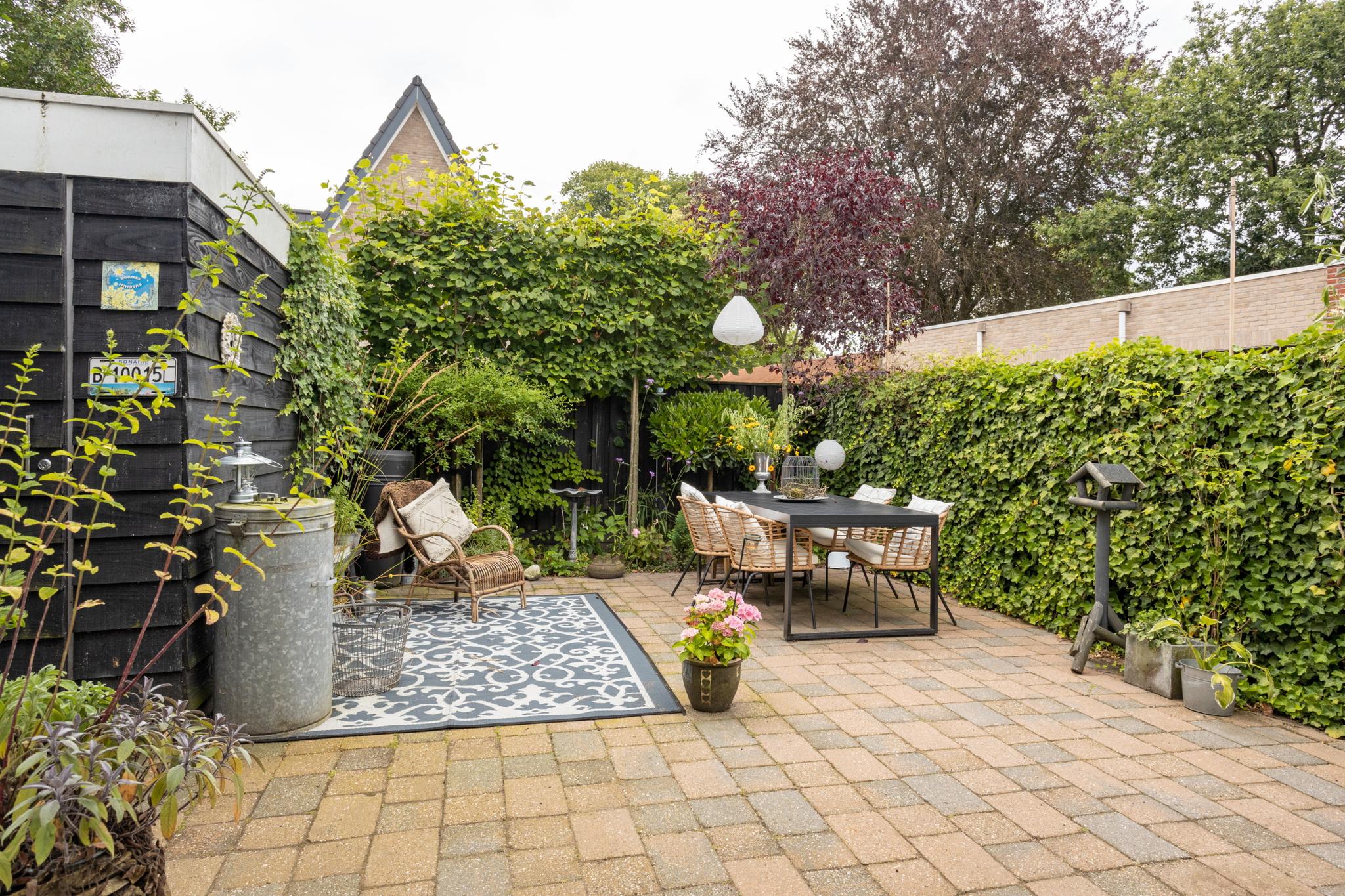 De achtertuin is voorzien van sierbestrating en diverse hagen en beplantingen. Hier kunt u in alle rust en privacy genieten van het buitenleven.