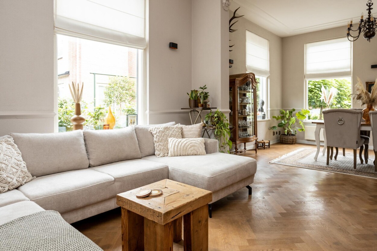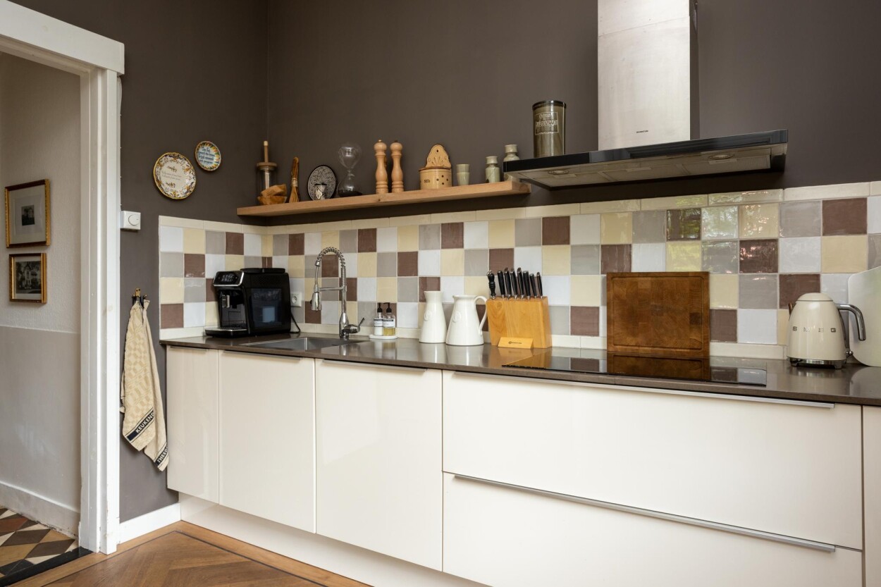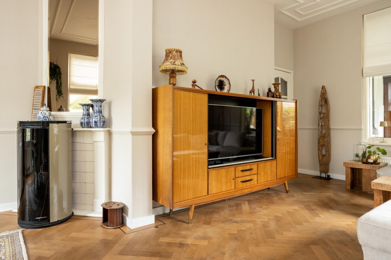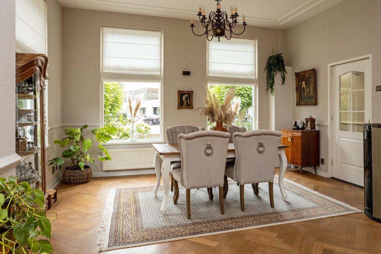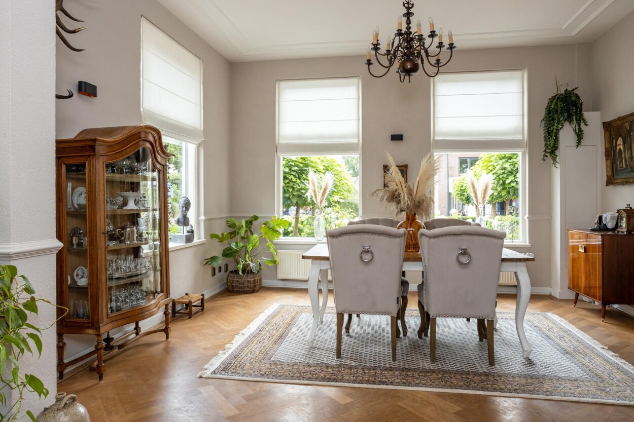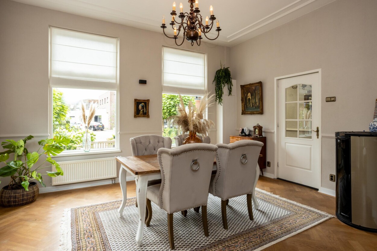 Bij binnenkomst via de entree aan de voorzijde, komt u allereerst in de originele vestibule. Hier treft u nog een authentieke tegelvloer en is er doorgang naar de hal, met daar de toegang tot een provisiekast, de toiletruimte, de kelder en de woonvertrekken. Direct vanuit de vestibule is ook de (voormalige) kamer en-suite te bereiken. Hier treft u aan de voorzijde een royaal eetgedeelte met uitzicht op de voorgelegen Stationslaan. Aan de achterzijde is een zithoek gerecreëerd. De gehele ruimte is voorzien van een visgraat parketvloer en een authentieke wand- en plafondafwerking met ornamenten en sierlijsten. Naast de reguliere verwarming middels CV kan er hier ook gebruik gemaakt worden van een pellet-kachel. De keuken is in een later aangebouwd gedeelte te vinden. De keukenopstelling is in 2017 vernieuwd en is voorzien van een koelkast, combi-oven, inductiekookplaat, vaatwasser en een afzuigkap. Direct vanuit de keuken is ook de aangebouwde serre en de achtertuin te bereiken.