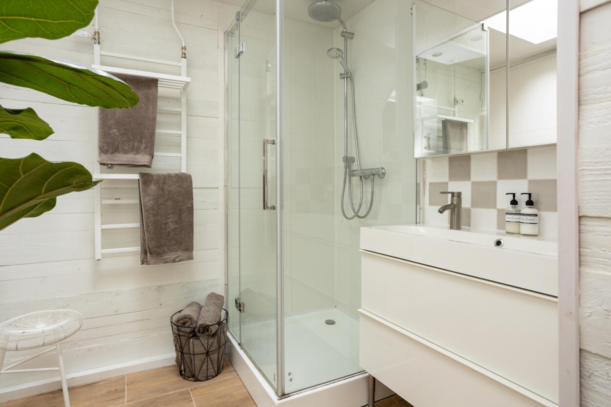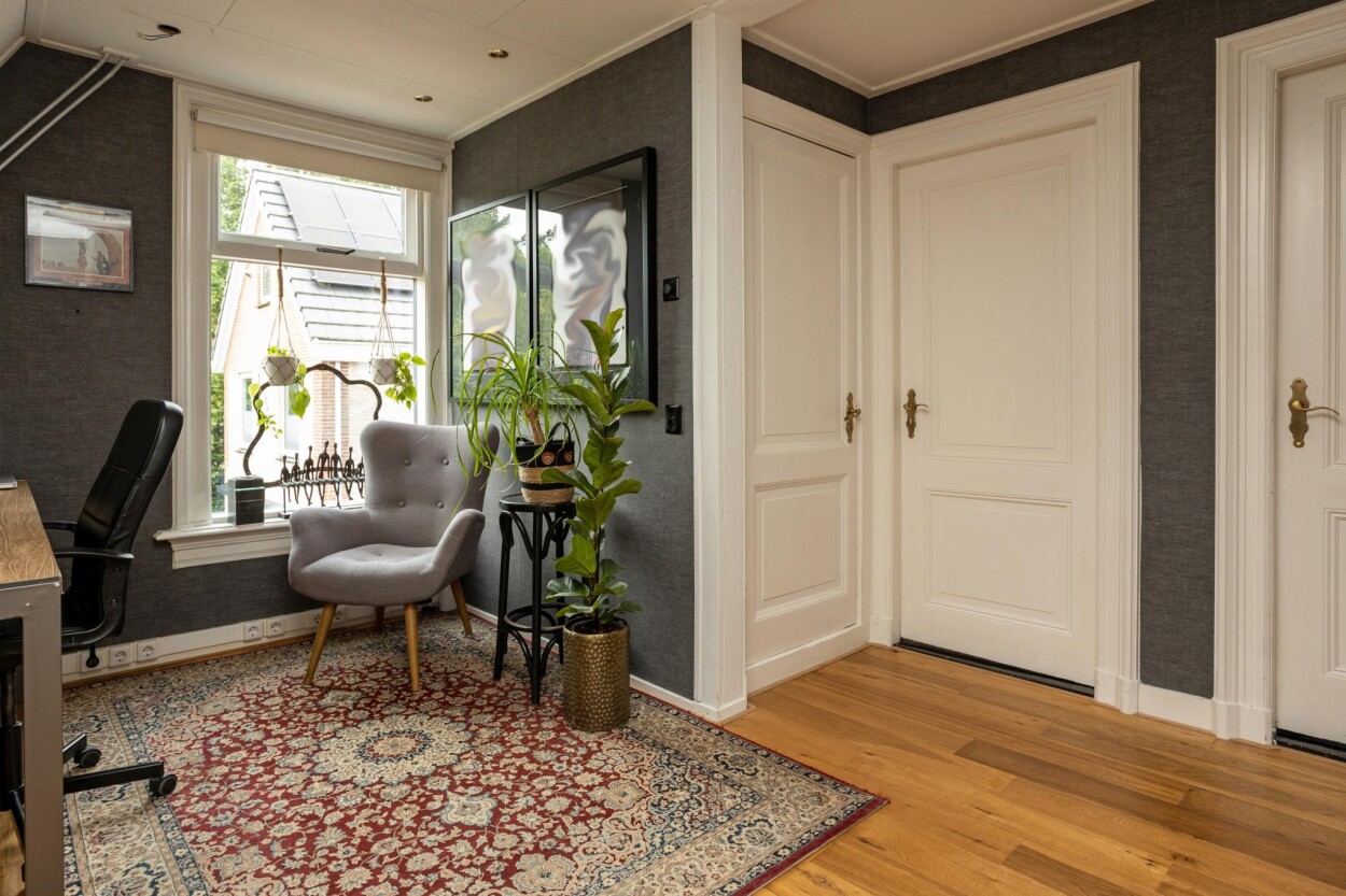 Middels een vaste trap bereikt u de bovenverdieping. Hier treft u allereerst een royale overloop, met daar zelfs ruimte voor een werkplek. Vervolgens is er toegang tot alle vertrekken op deze verdieping. Aan de voorzijde zijn er twee slaapkamers, waarvan één ouderslaapkamer. Vervolgens is er aan de achterzijde een derde kamer te vinden, die momenteel in gebruik is als kastenkamer. De badkamer is voorzien van een douchecabine en een dubbele vaste wastafel met meubel. Ook is hier de doorgang naar de bergzolder. Tenslotte is vanaf de overloop nog een separate toiletruimte te bereiken.