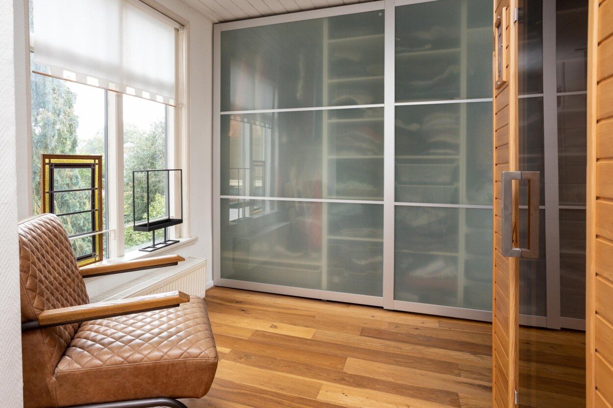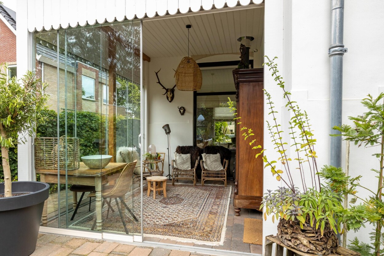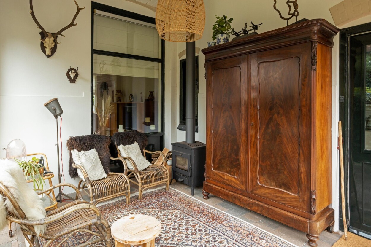 Grenzend aan de keuken is een serre aangebouwd. Een heerlijke ruimte waar u dankzij de glazen schuifwanden, dakisolatie en houtkachel ieder jaargetijde toch kunt genieten van het buitenleven.