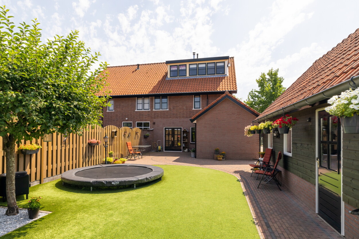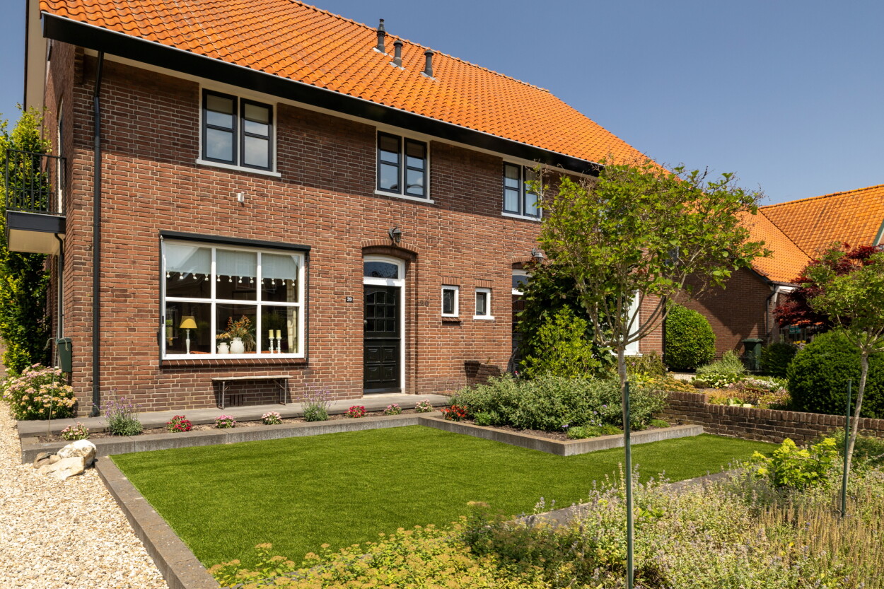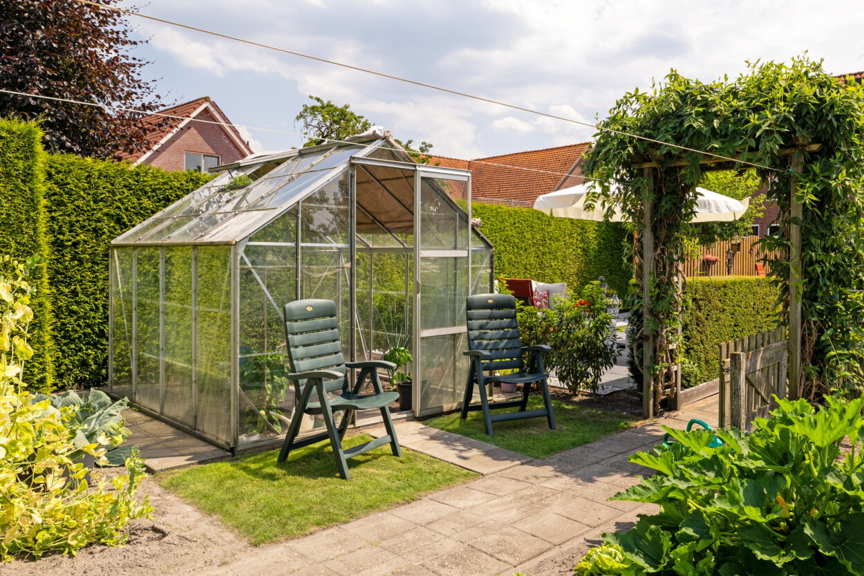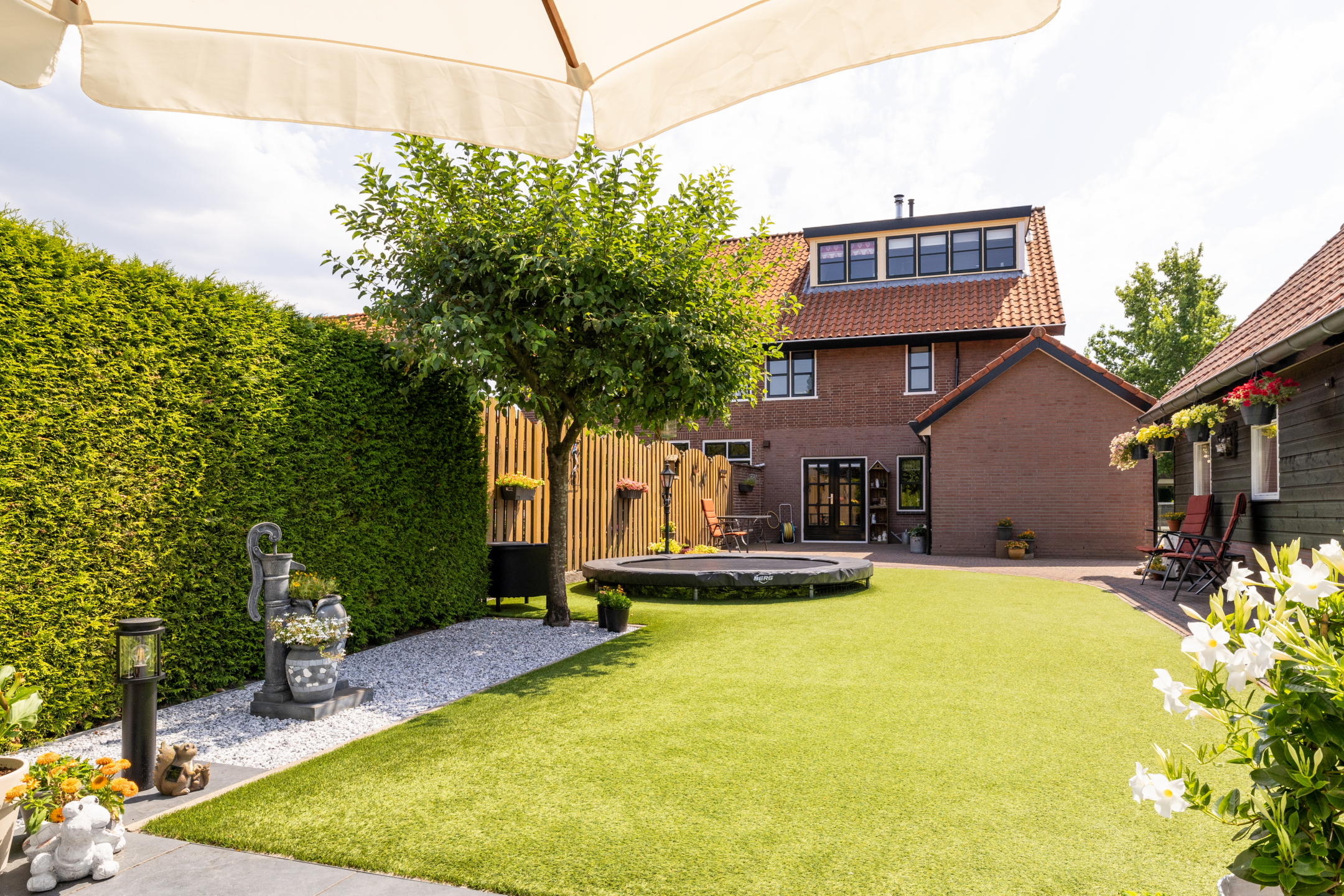 Tuin: De voortuin is keurig en onderhoudsvriendelijk aangelegd met kunstgras en diverse borders. Aan de zijkant van de woning bevindt zich een brede oprit, afgewerkt met grind, die moeiteloos parkeergelegenheid biedt voor meerdere auto's. De diepe achtertuin is gelegen op het noorden en is eveneens onderhoudsvriendelijk aangelegd. Door de royale diepte van de tuin geniet u hier van veel privacy en zijn er altijd verschillende plekjes te vinden waar u heerlijk kunt zitten, zowel in de zon als in de schaduw. Er zijn verschillende terrassen, waar je heerlijk zitjes kunt creëren en achterop het perceel is er een ruime moestuin aanwezig.