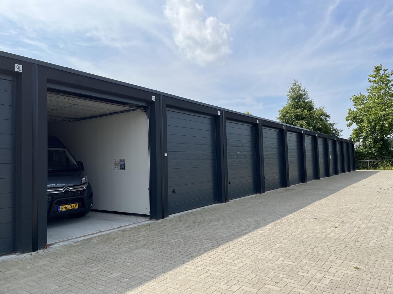 De afmeting van de box is ca. 3.1x8.7 m en heeft een overheaddeur met een doorrijhoogte van ca. 2.9 m.
